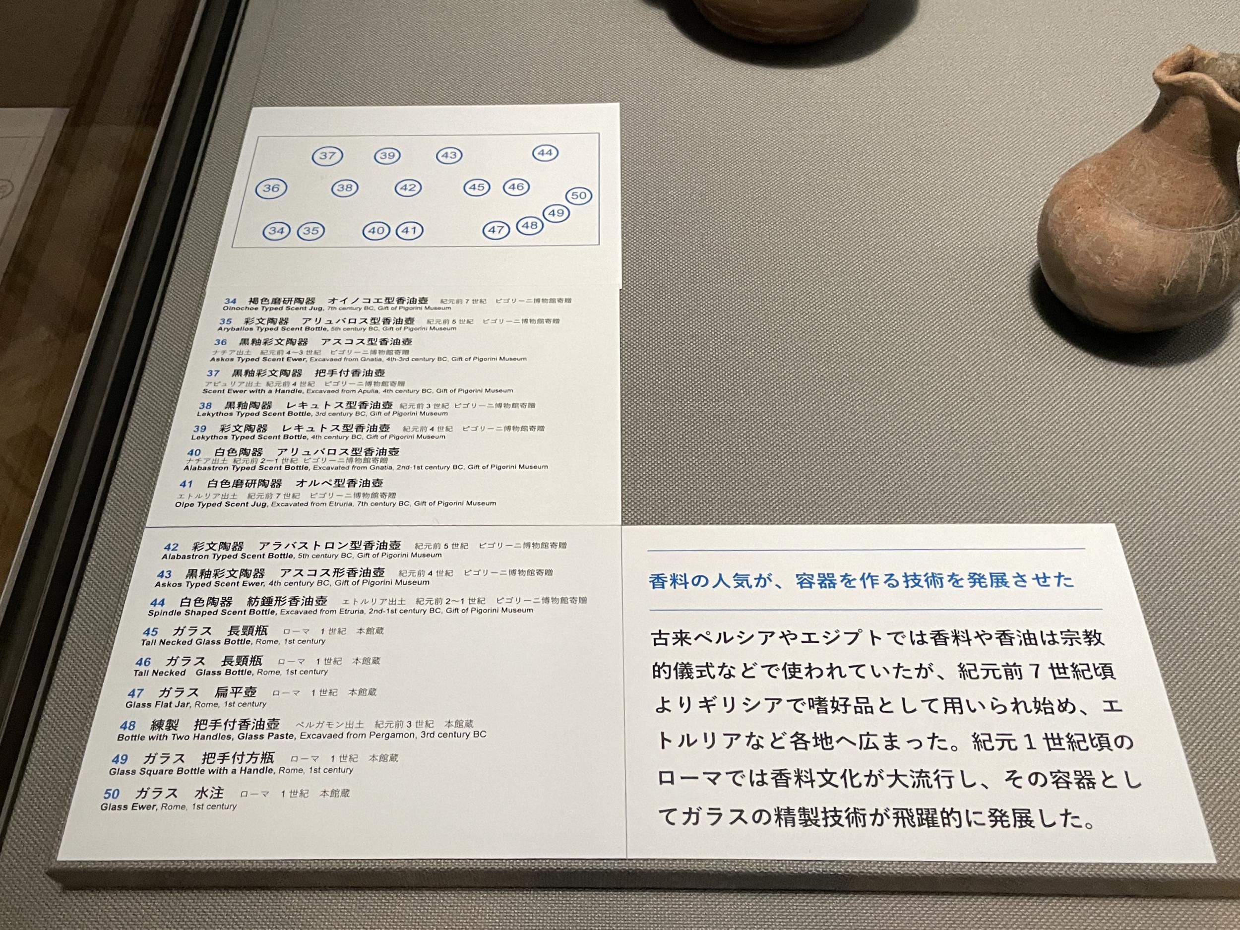 大阪市立美術館で万博一番人気だったイタリア館の展示が実施できたのは、ファルネーゼのアトラスはナポリ国立考古学博物館所蔵ですが、ピゴリーニ博物館と大阪市立美術館との寄贈交換という歴史が背景にあったのかも知れません。香油壺だけじゃなくて、大阪市立美術館に所蔵されている大型陶器やテラコッタ像が公開される機会がいずれあるはずです。