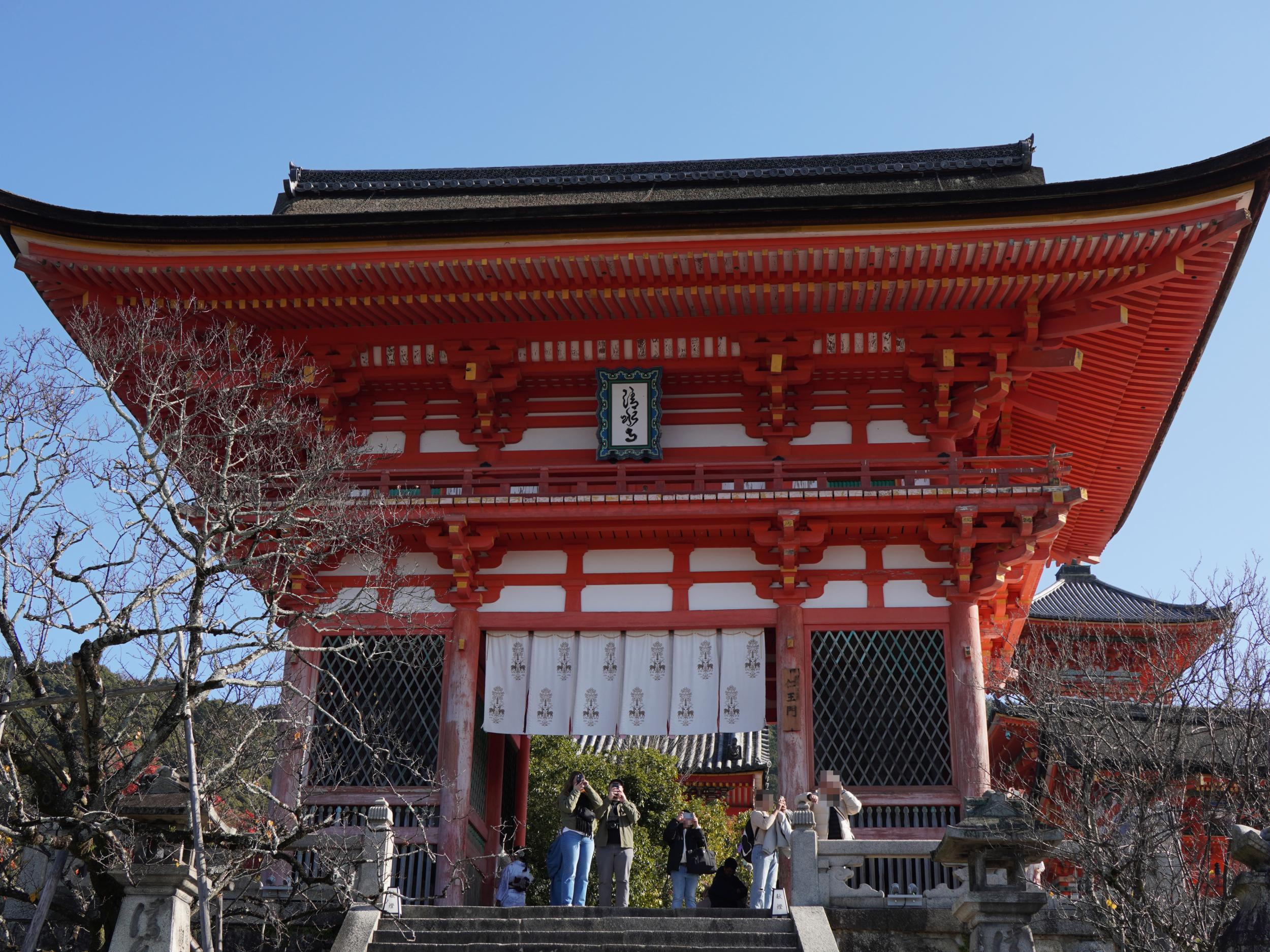 重要文化財の仁王門、その右手に西門と三重塔、いずれも重要文化財。清水寺は9年も前に雪見して以来です。
