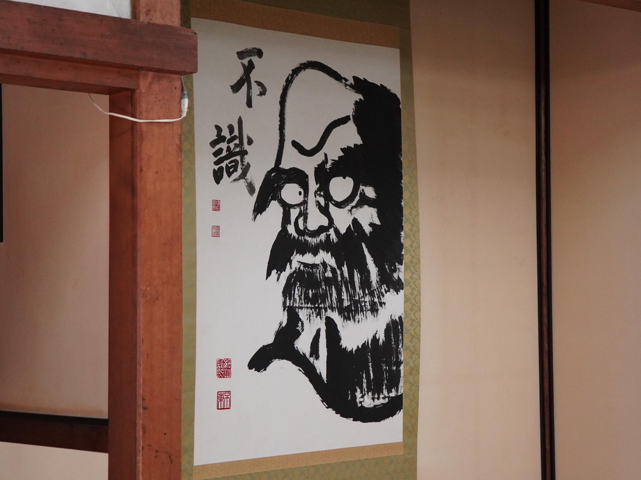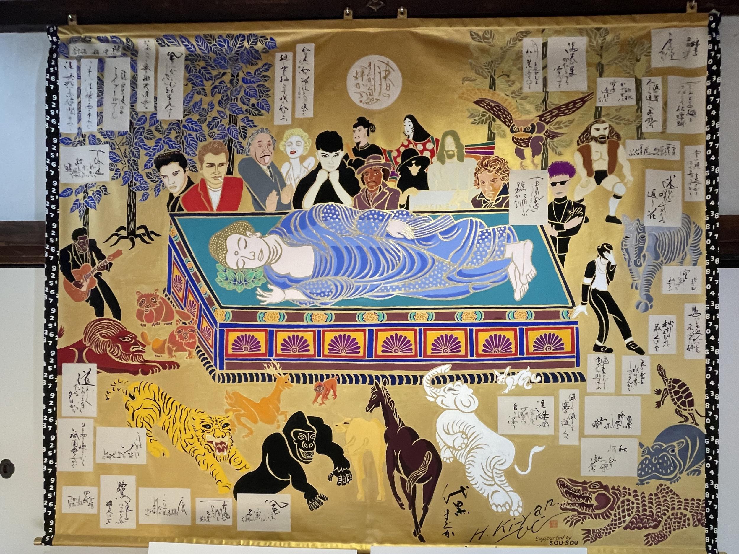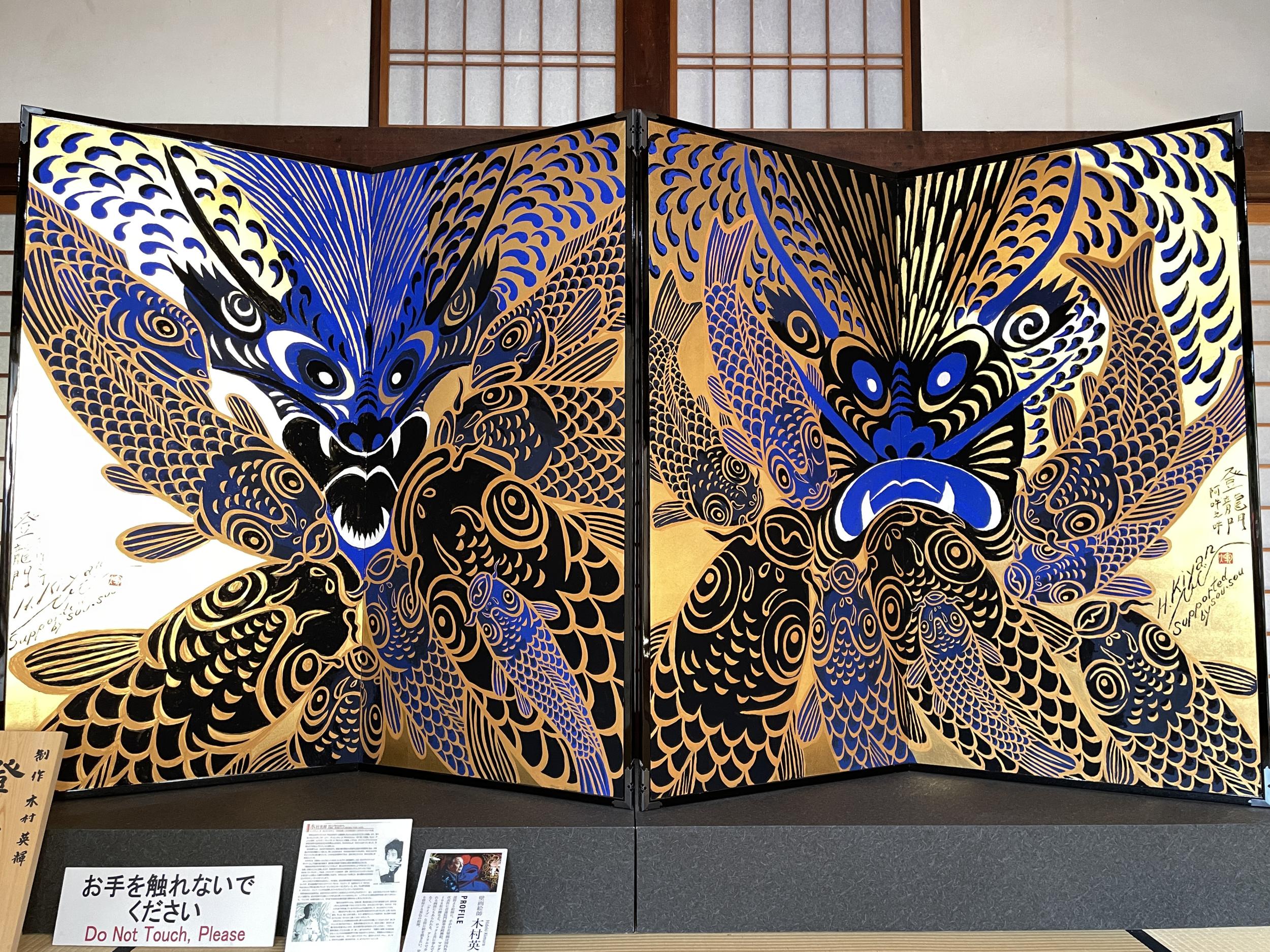 見たことのある顔ぶれが並ぶ「俳句涅槃図」は俳人・黛まどかさんと壁画絵師・木村英樹さんの共作、十二単は紫式部ではなく清少納言らしい。木村英樹「登龍門絵図屏風」は鯉と阿吽の龍。どこかで見たような色使い、青蓮院門跡の襖絵です。