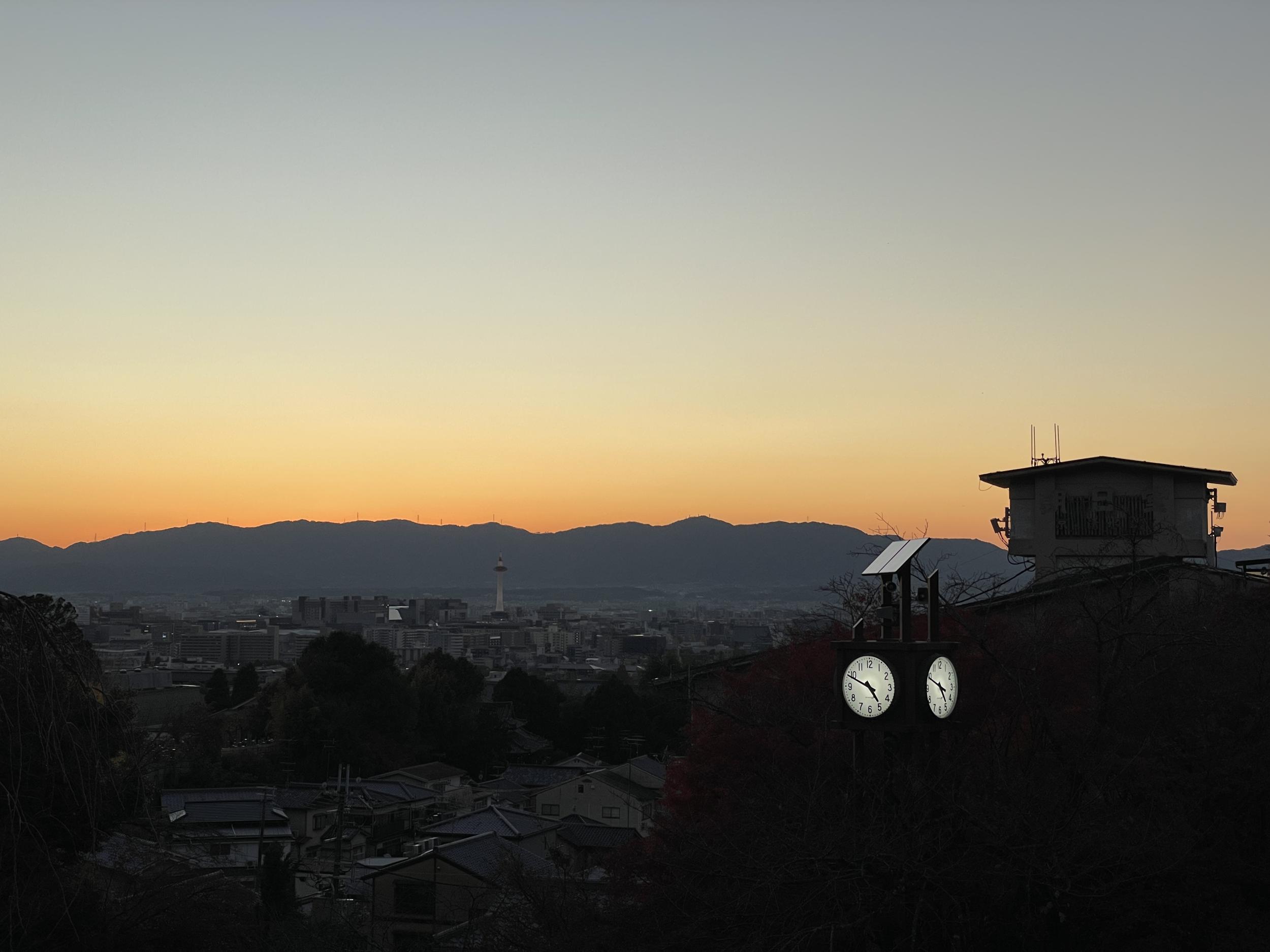 京都タワーが美しくなってます。左隣はネイホウ、後はボナセーラ、右隣は日本人夫婦です。肌寒いものの風がなくて良かった。まだ5時17分、だいたいこの辺です。