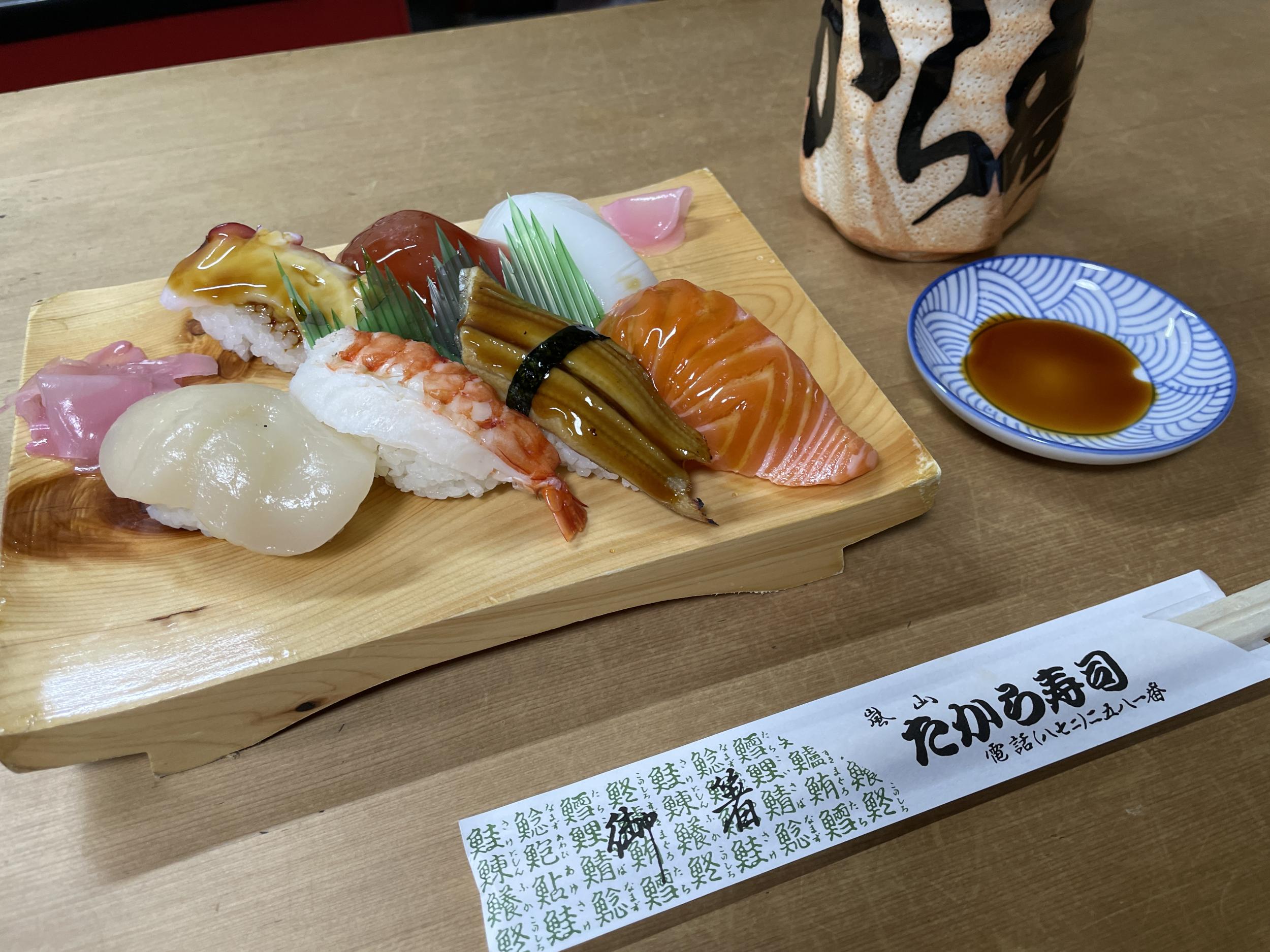 阪急嵐山駅より阪急嵐山駅前バス停にほど近い、Google Map★4.9のお寿司屋さんでランチ。暖簾も看板もないのですが、この店かなと覗いてみたら、中の人(大将)と目があって招き入れられました。シャッターの下りてるビューティーショップ隣です。
