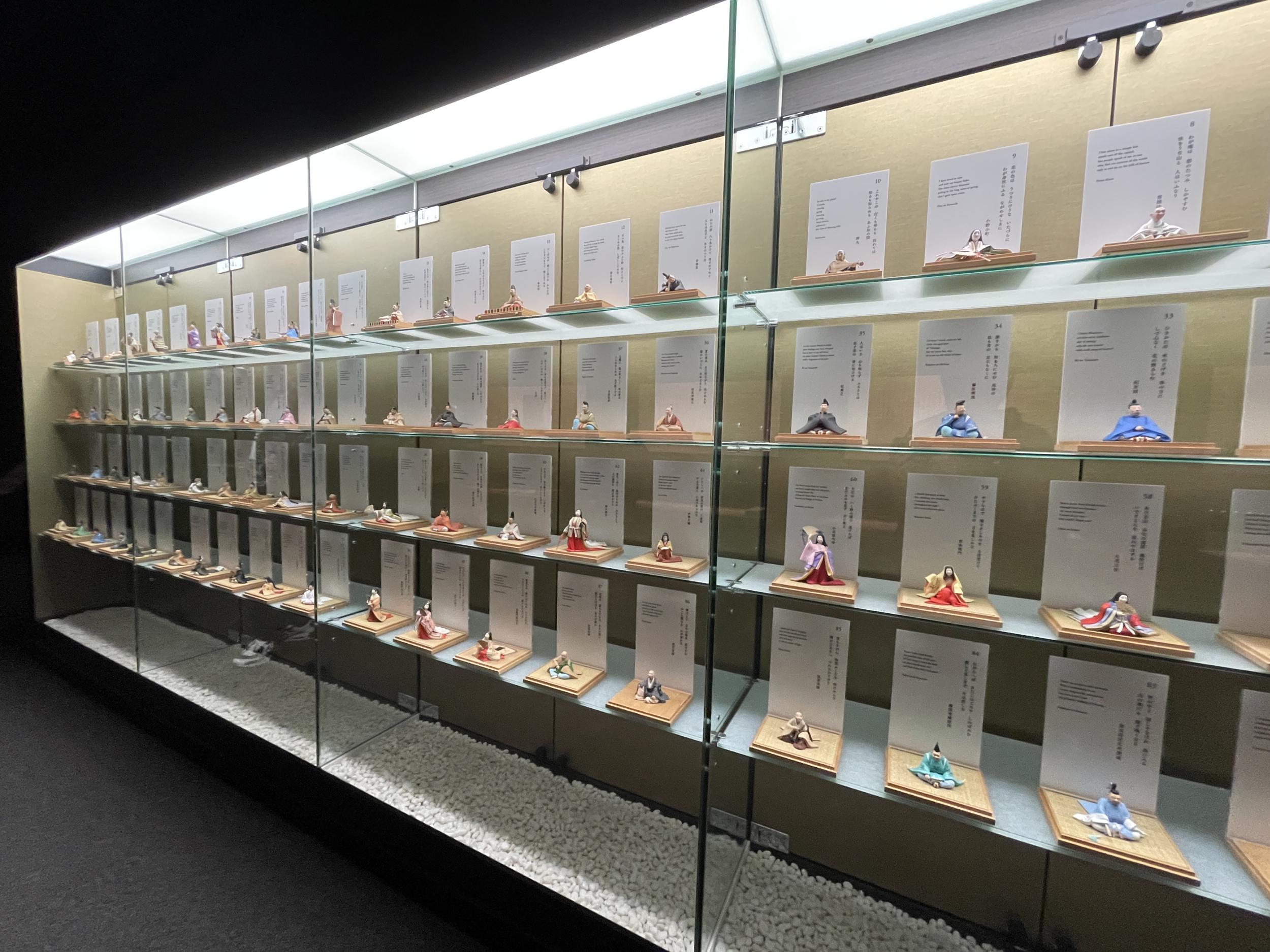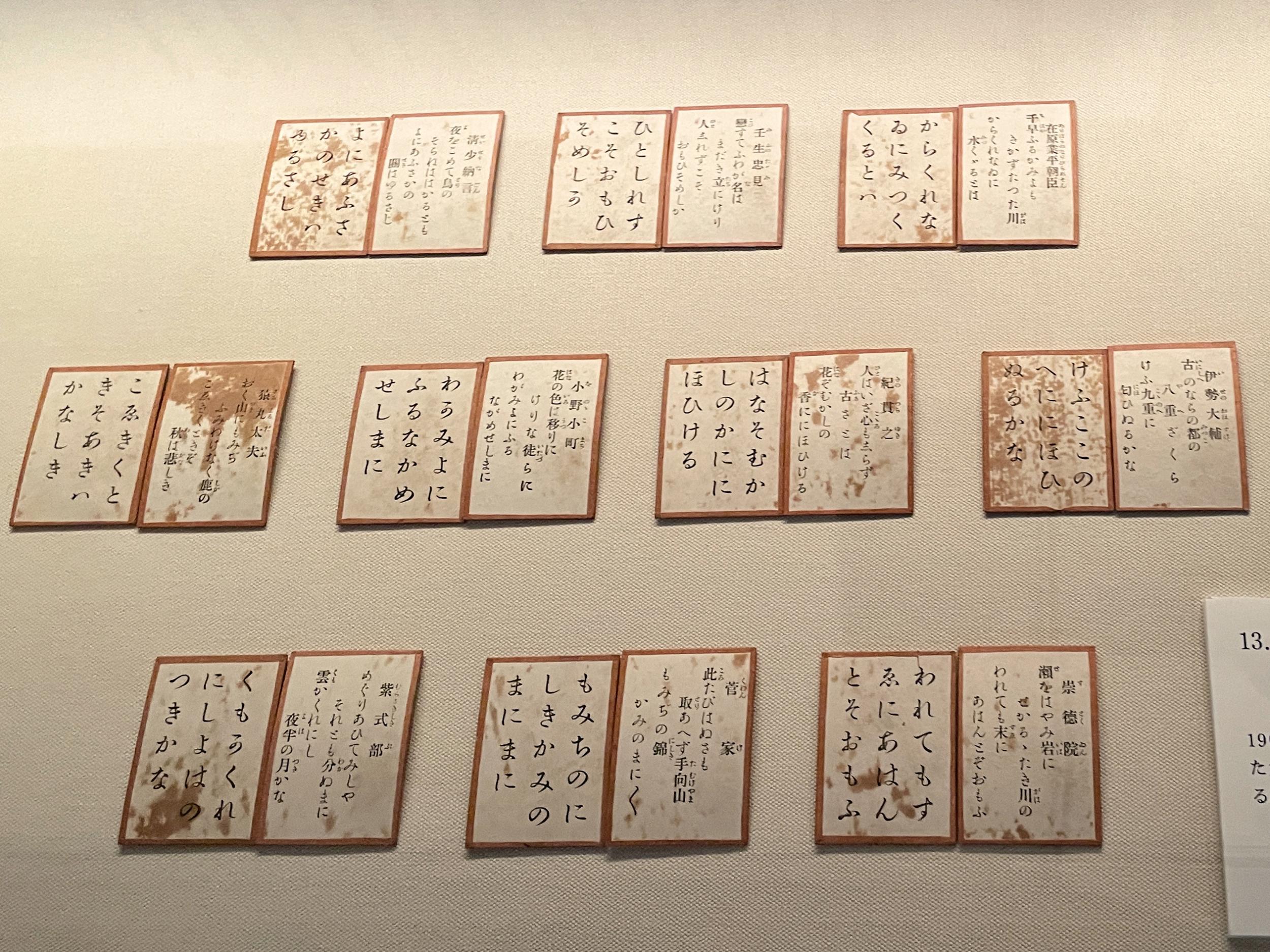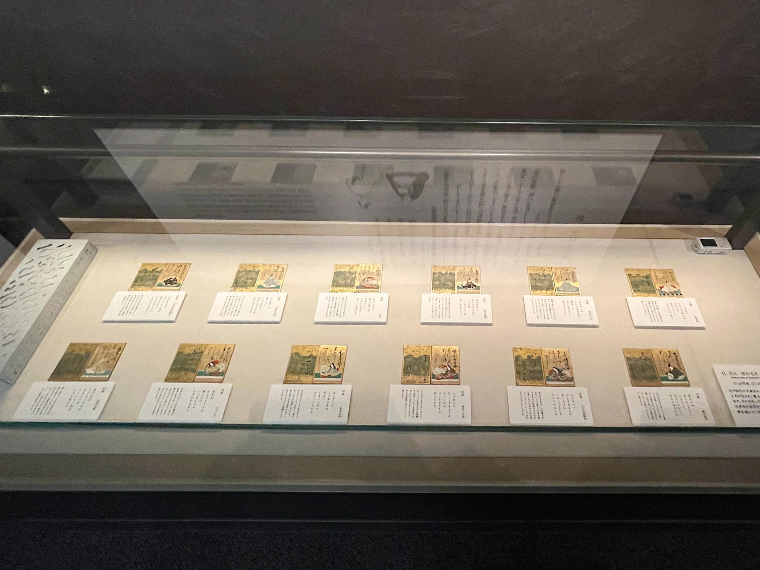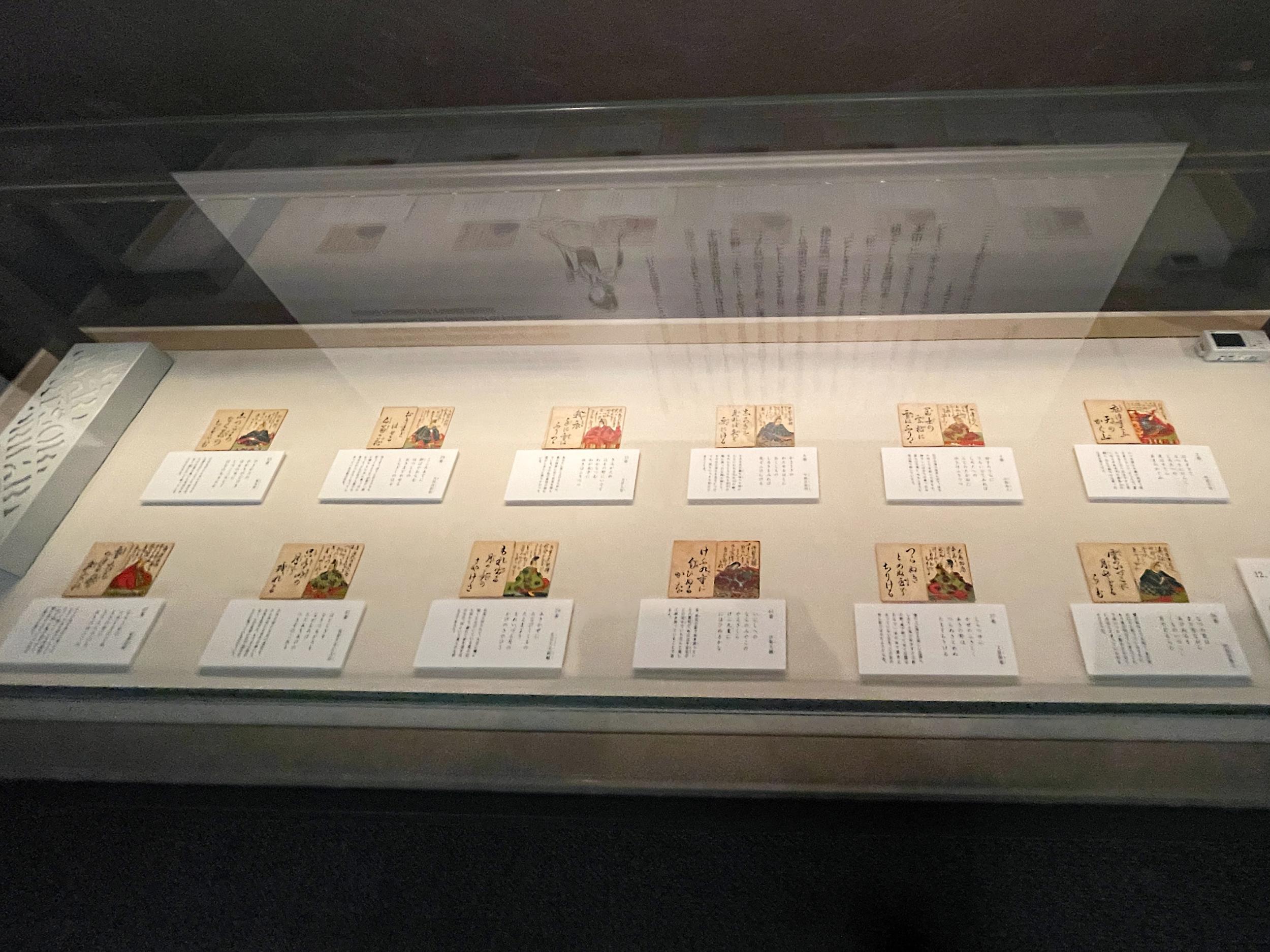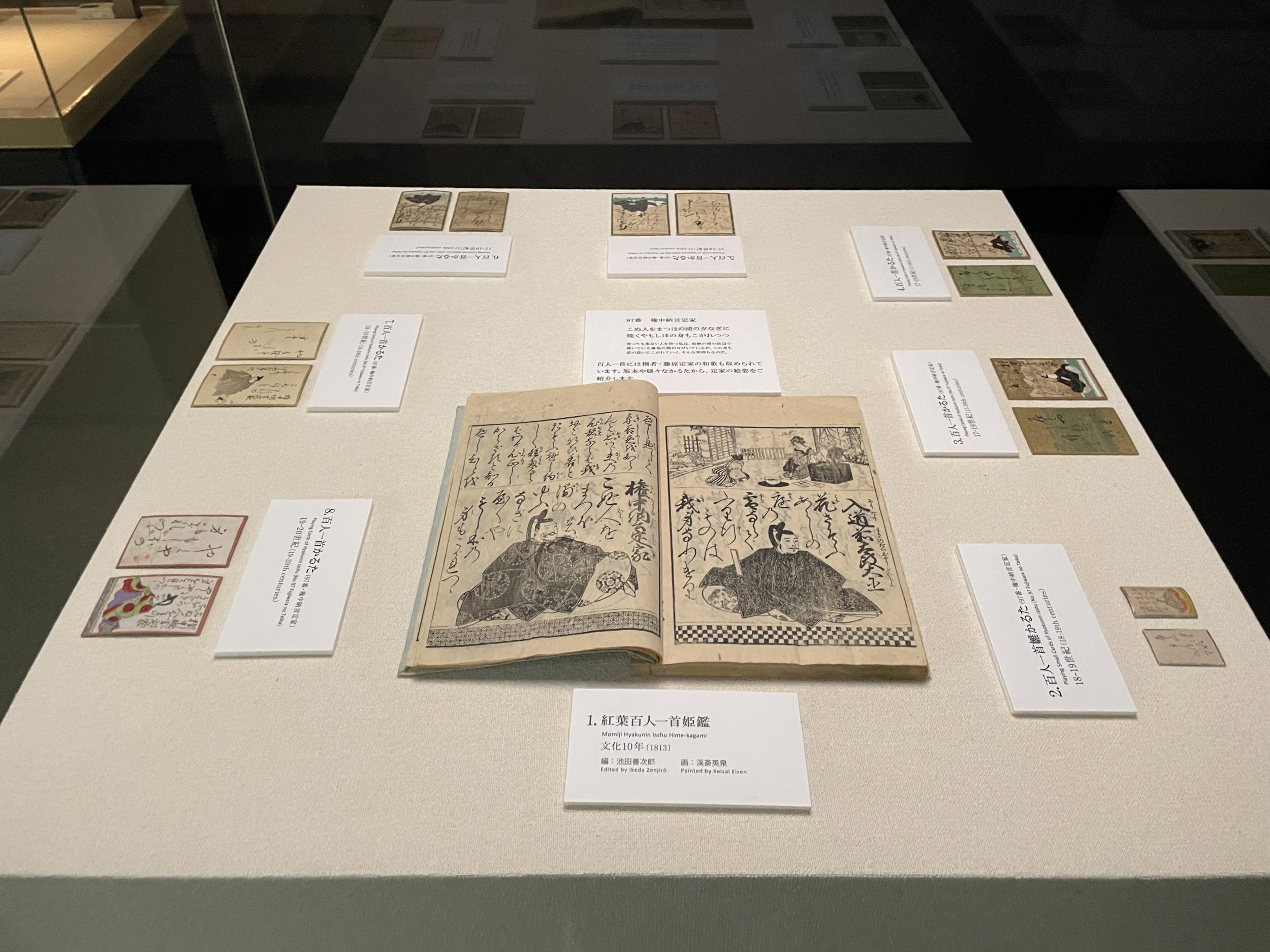 常設展の「百人一首ヒストリー」。紅葉百人一首姫鑑(ひめかがみ、文化10年、1813年)は女性のための指南書、周りは17~19世紀の百人一首97番権中納言定家の札ばかりが並べられています。