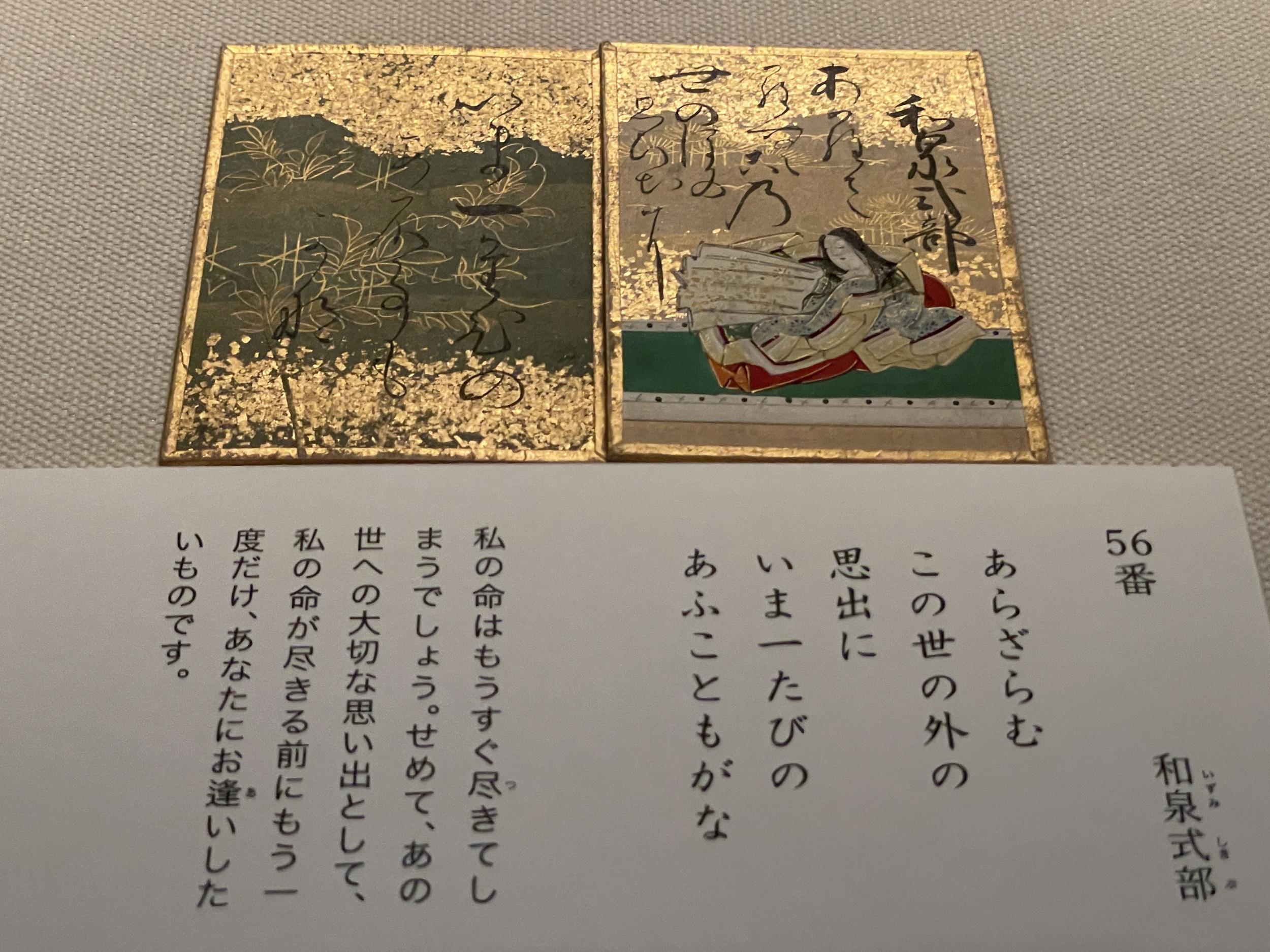 上の句と歌人名の読み札だけでなく、下の句の取り札も金箔の豪華な江戸時代の手書きかるた、その56番和泉式部です。