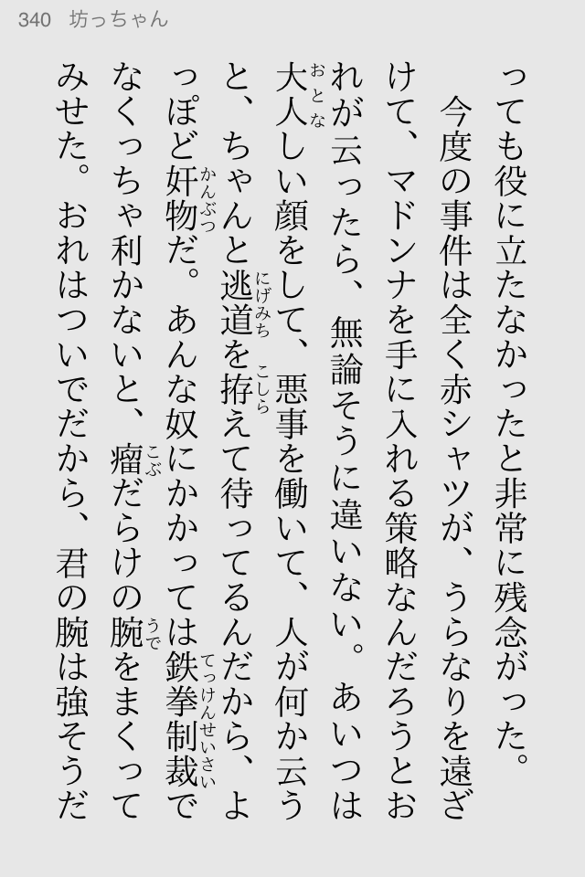 とても読みやすく美しい明朝体の縦書きで行間も広くとても見やすい表示です。ページの左右端をタップ、あるいは左右にスワイプしてページ送り、中央をタップすると操作メニューが表示され、しおりを入れたり、横書きに変えたり、ページ移動したり、読書に最適な操作が並んでいます。
