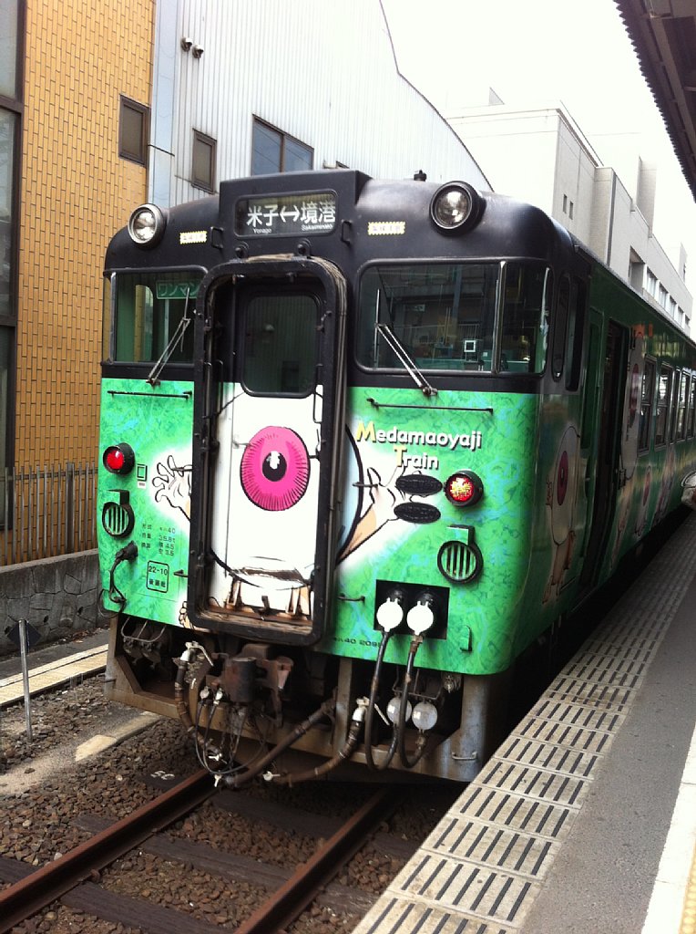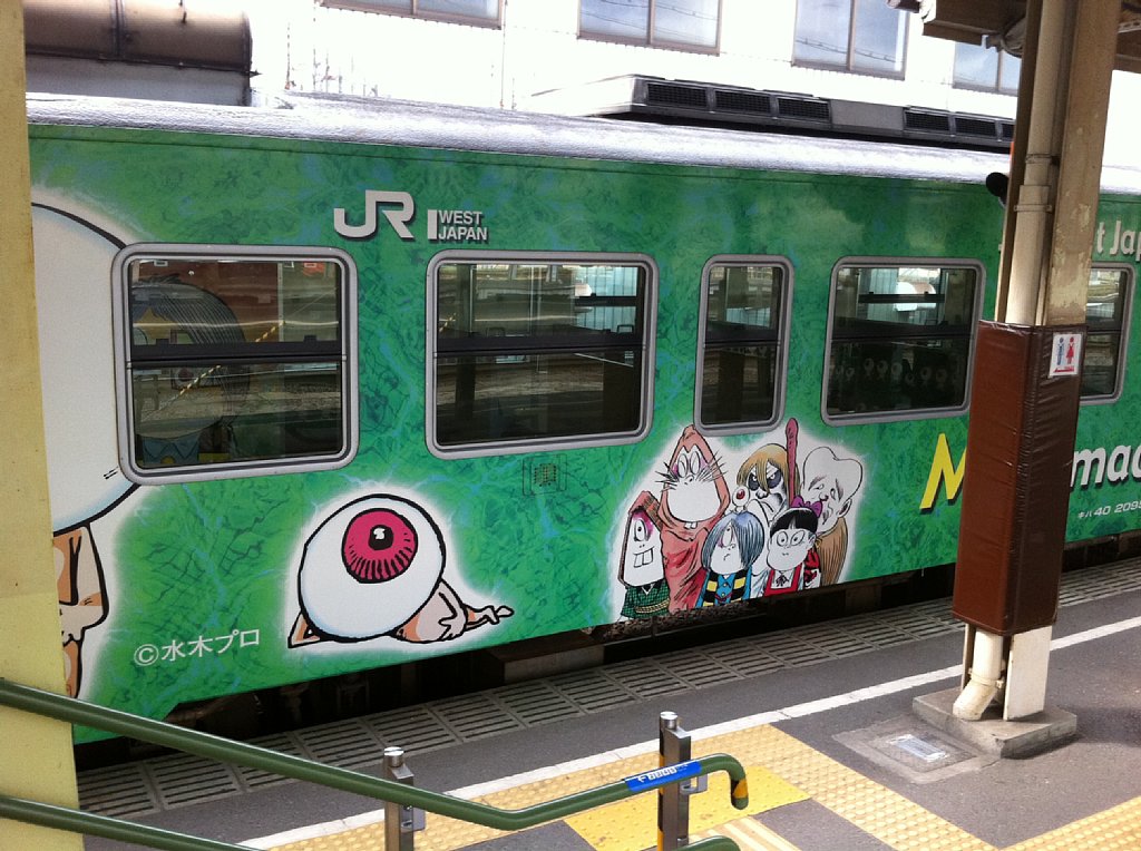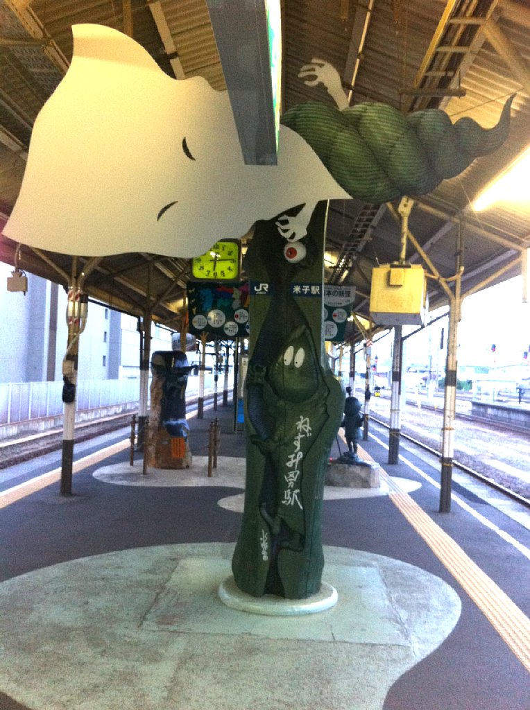 米子駅はこのホームでは「ねずみ男駅」、本来「0番線」ですが「霊番線」と呼ばれます。