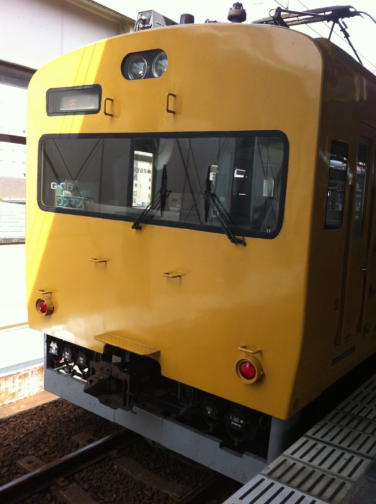 米子-西出雲間の山陰線は電化されていて伯備線の電車が乗り入れます。写真はJR西日本の山陽色ドドメ色に塗られた、中間車改造のクモハ、かなりブサイクですが、中は昔ながらのボックスシートになっていて旅情があります。