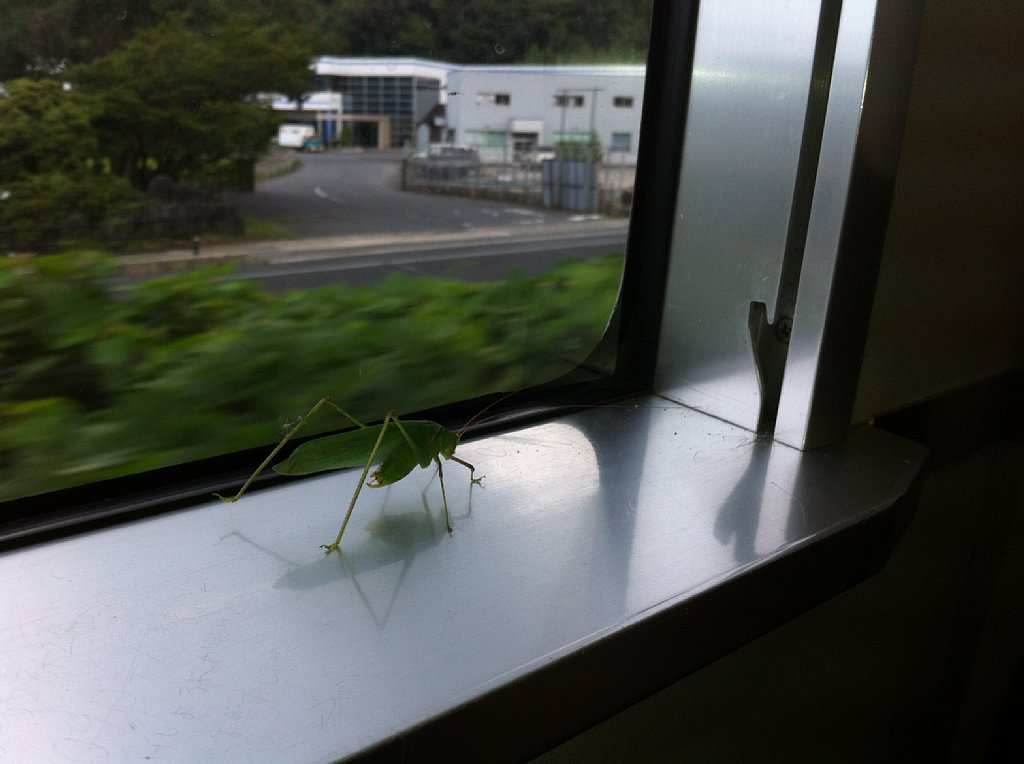 安来駅から相客になったバッタ君です。ちなみに伯備線の各駅停車に米子発11:03、なんと播州赤穂行きというのがあります。これに乗れば新快速乗り継ぎで17:43に大阪着です。一度試してみたいなと思っています。