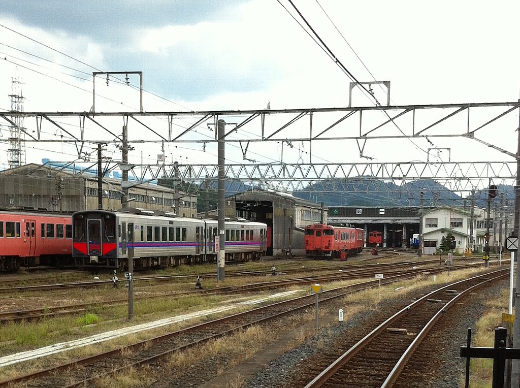 出番を待つ気動車たち。タラコ色(国鉄時代の首都圏色)は山陰ローカル用のキハ47系、ピンクは同じキハ47系の「ねこ娘号」、黄色い帯は特急「スーパーおき」のキハ187系、右端の赤い帯は快速「アクアライナー」用のキハ126系です。