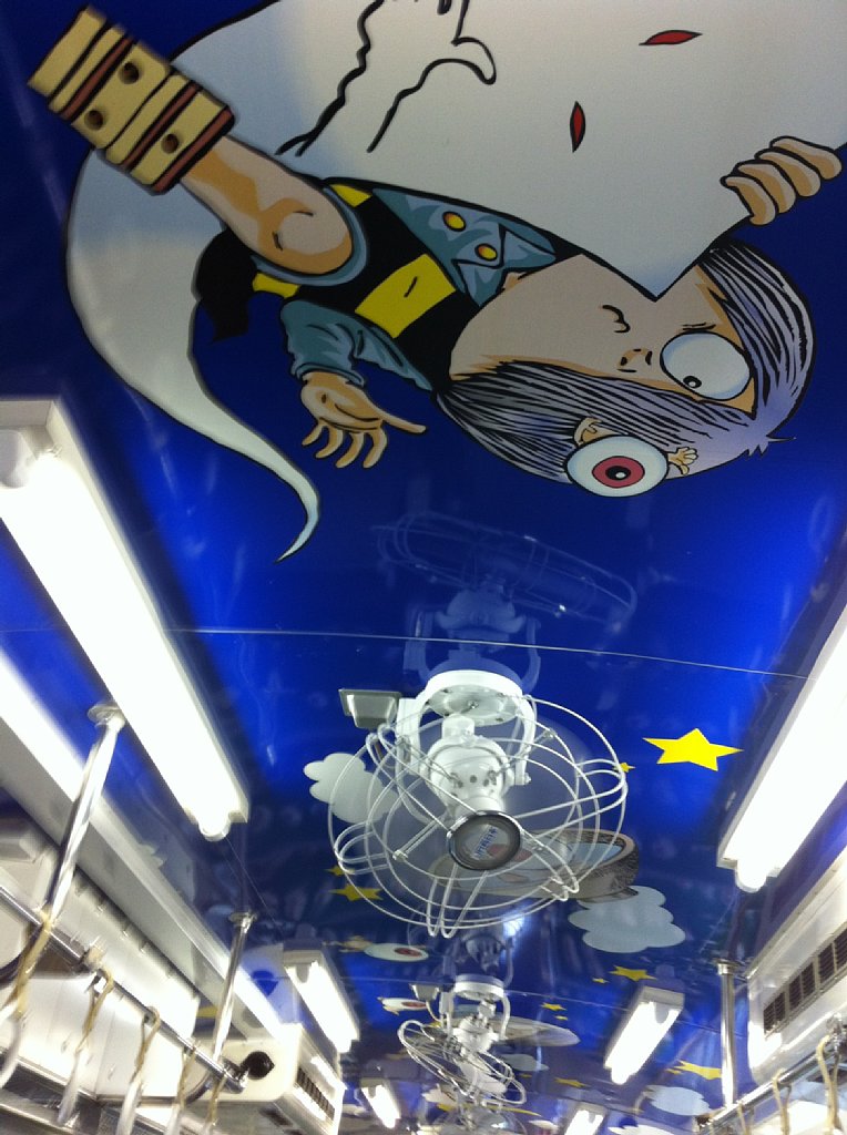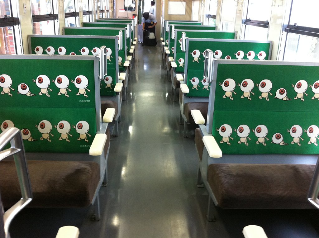 車内も凝ってます。JR四国の「アンパンマン列車」やANAの「ポケモンジェット」より凝ってます。扇風機が残されているのも嬉しいです。