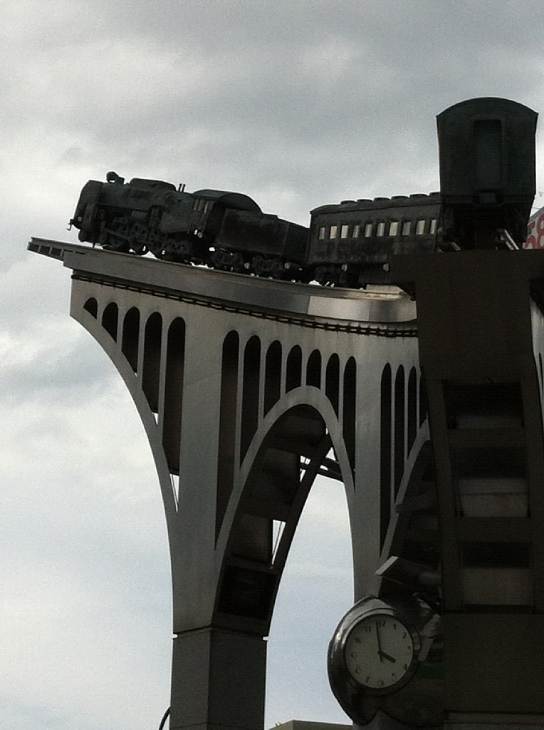 駅の外にも銀河鉄道999のでっかいモニュメントが建っています。10階建てのビルぐらいあります。交通の要衝として鉄道関係者の住民も多いのでしょうね。