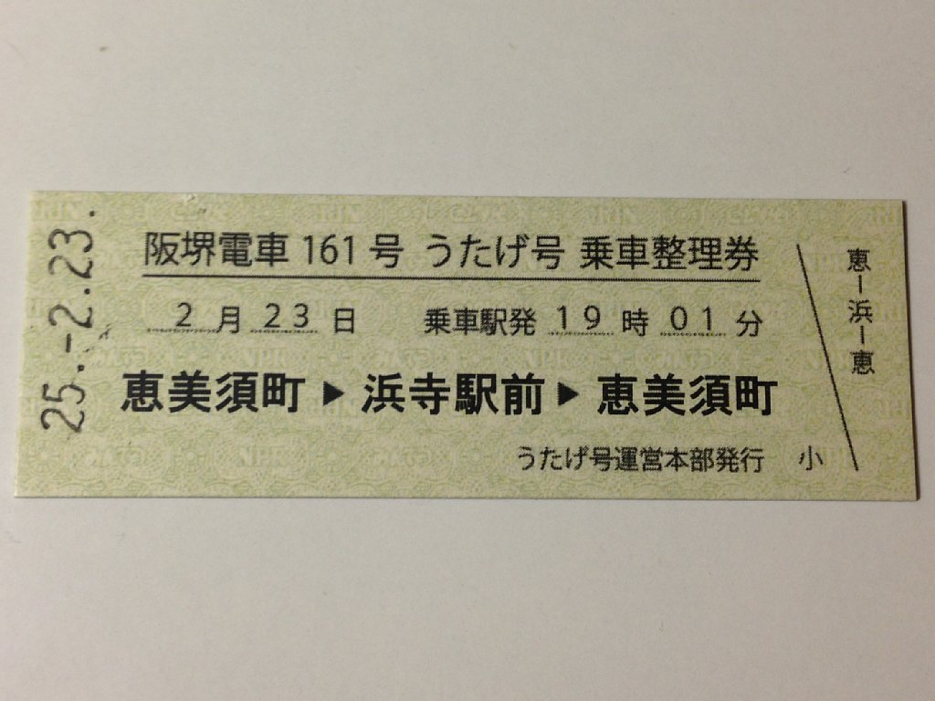 全員に配られた、硬券の乗車整理券、幹事さんのセンス良すぎ!19:48浜寺駅前駅到着、トイレ休憩。