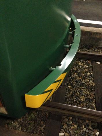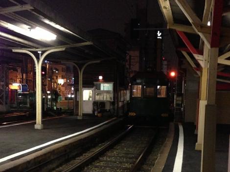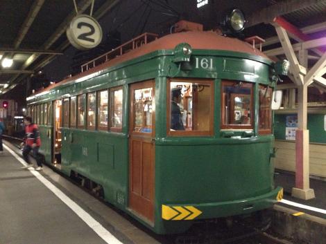 18:50、予定より少し早く恵美須町駅2番線に入線。高度な職人技を感じさせる塗装、他のモ161形たちがかわいそうなくらいです。