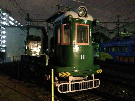 折り返して、我孫子道車庫でふたたびトイレ休憩。写真では見えませんが、うわさの新型、堺トラムが車庫の中でお休みしていました。電動貨車デト11を近くで撮影。