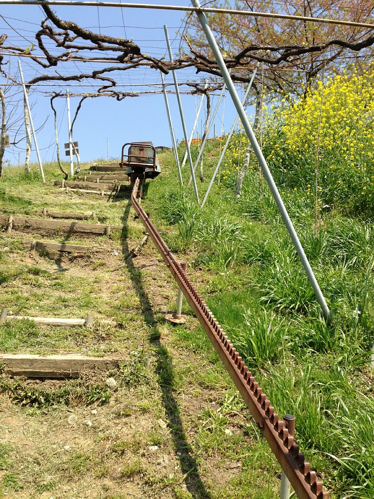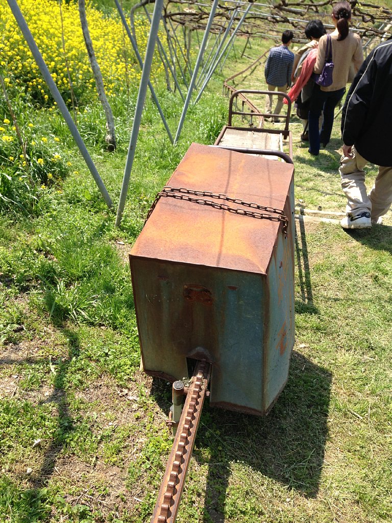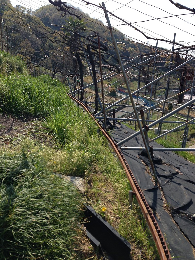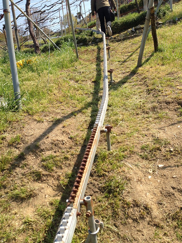 坂がかなり急になってくると、農業運搬用モノレールが登場しました。ダッシュ島でも登場するあれです。辿っていくと、樹齢99年というこのワイナリーで最高齢の古木がありました。大切に大切に育てられているようです。