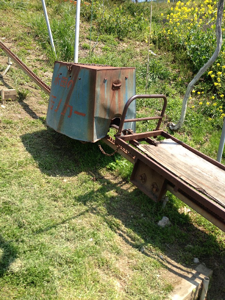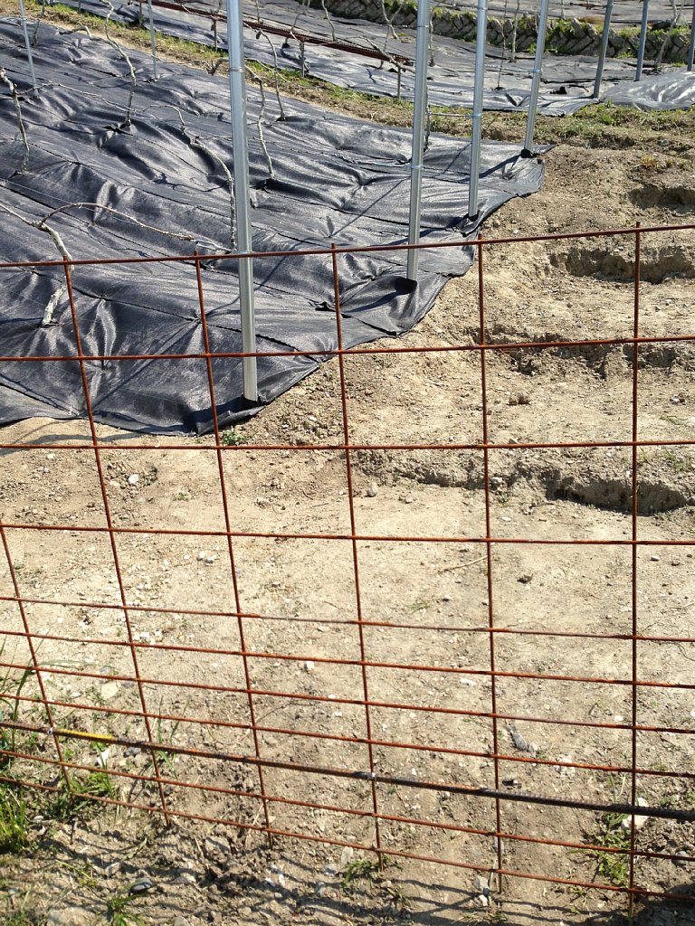 山の上の方には新しい畑が作られています。やきとり屋さんやフレンチレストランの方がボランティアで栽培されている畑だそうです。鉄の柵はいのしし避けです。鳥やいのししの被害は生易しいものではない由。