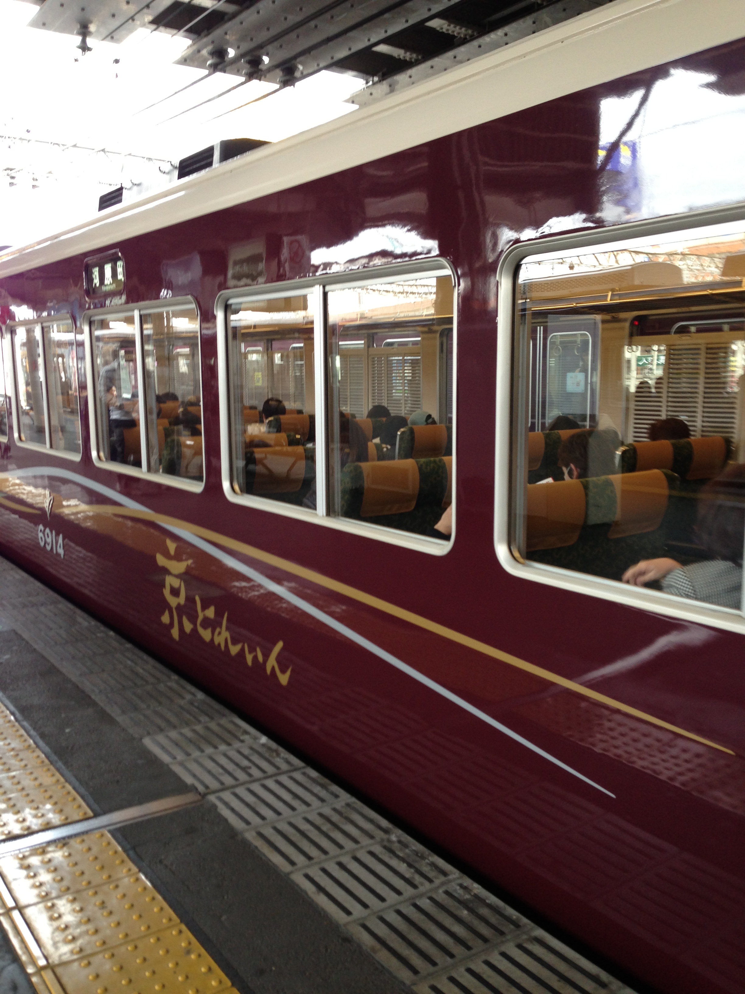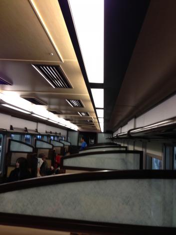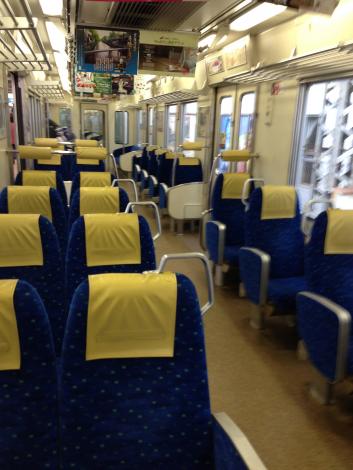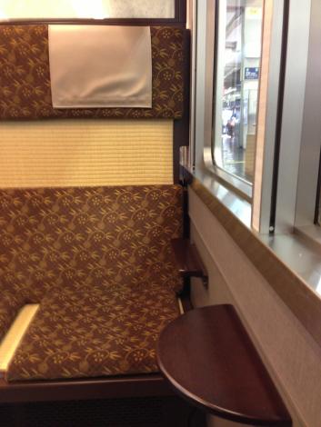 乗ったのはボックスシートになった中間の車両、たたみに座布団という「京風」です。前後の車両はふつうのクロスシート。