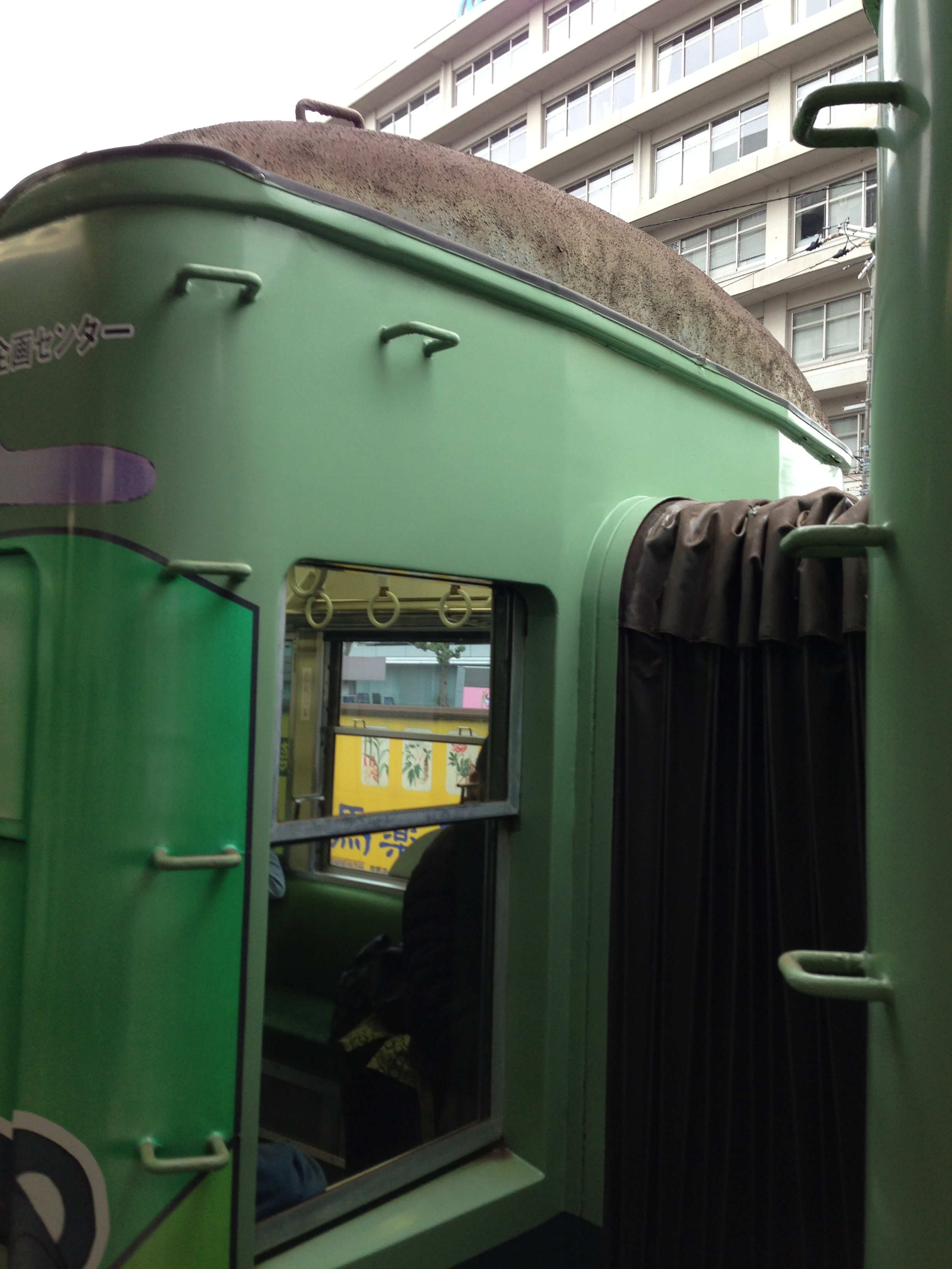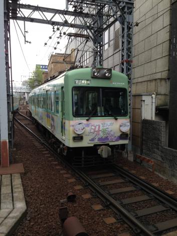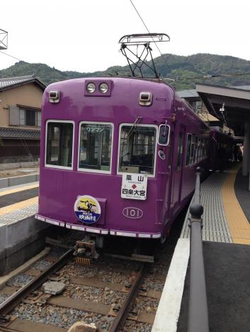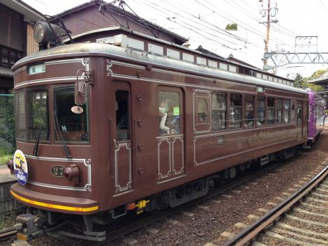 嵐山から四条大宮行きの2両編成の前はモボ101、内装もかなり改造されているので、気が付かなかったのですが、調べてみると、何と昭和4年製だそうです。つまり阪堺電車のモ161と同世代の電車です。以前のくすんだベージュとグリーンのカラーリングの方がずっと好みですが、この新しい紫、結構悪くないとも思います。改めて見てみると懐かしい「オバQ」に似てます。