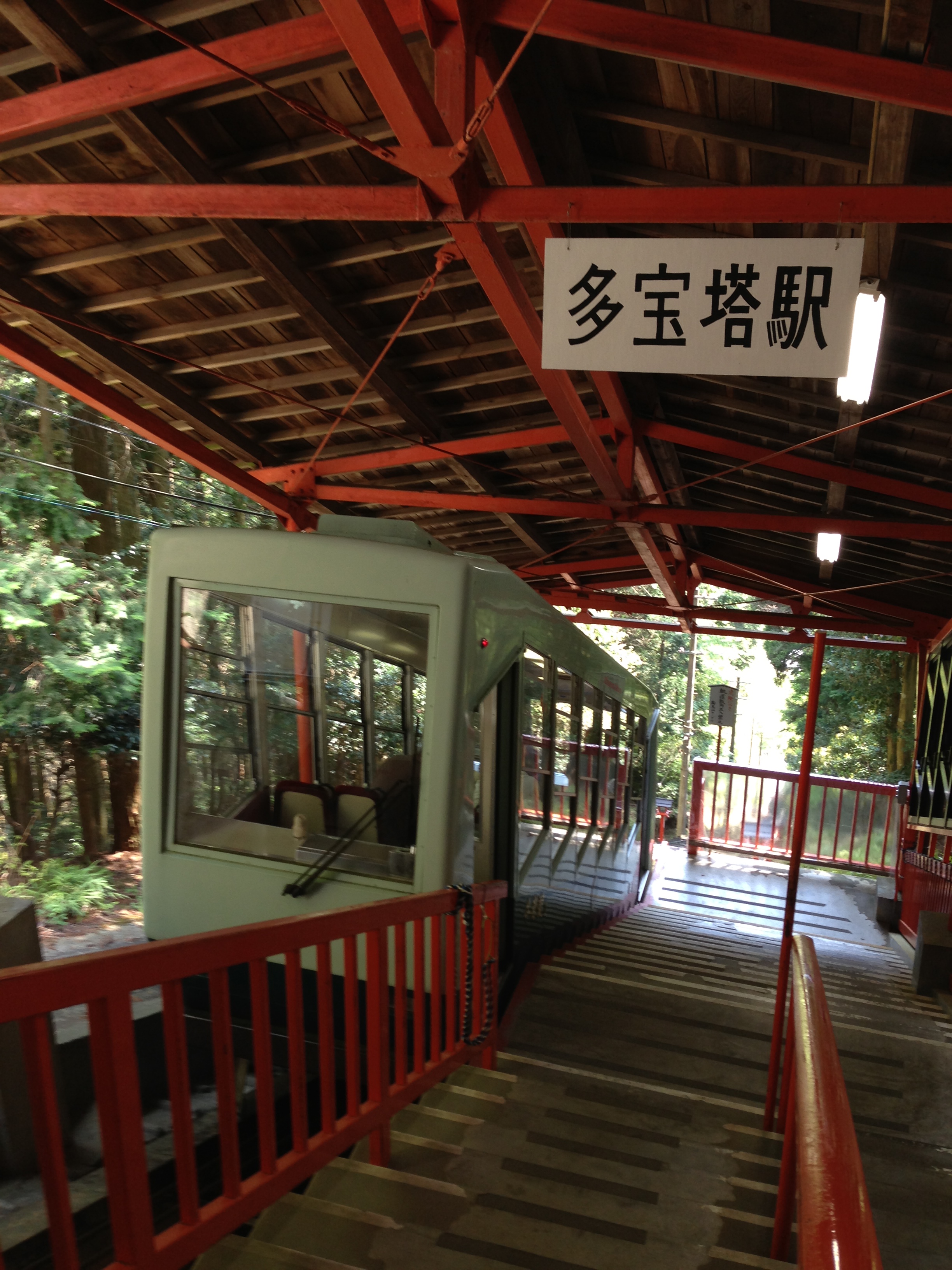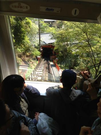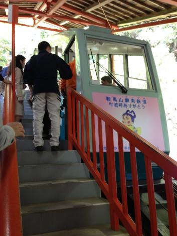 このケーブルカー、鞍馬山鋼索鉄道といい、宗教法人鞍馬寺の運営、駅員さんたちも作務衣を着たお寺の人たちです。