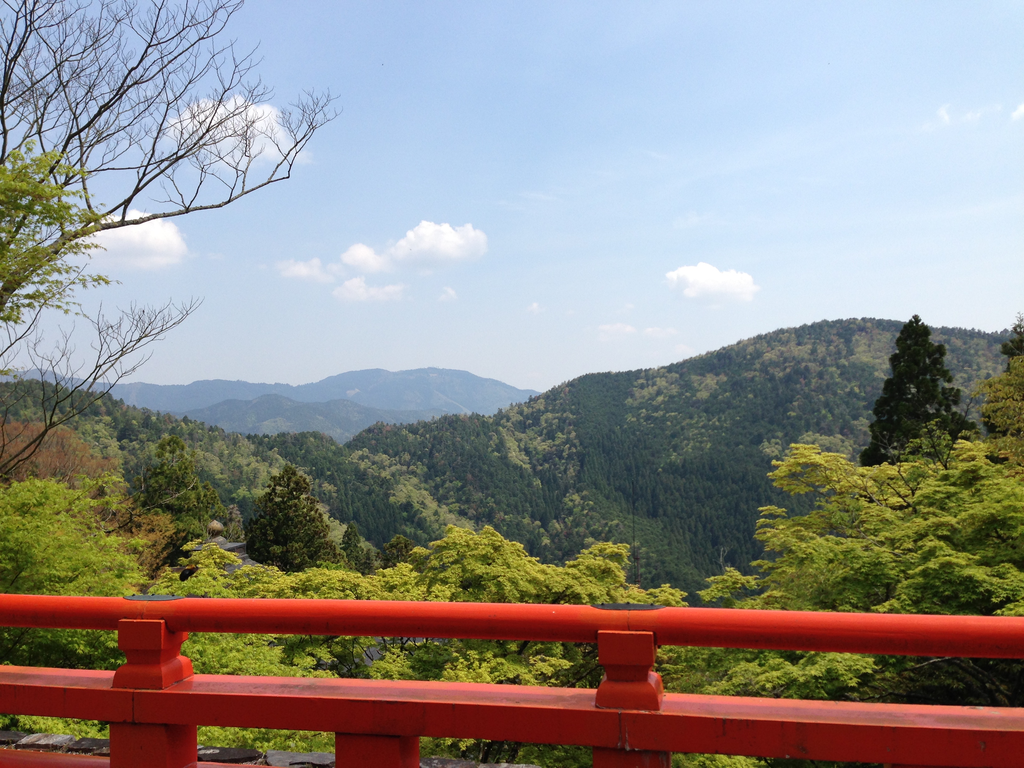 多宝塔駅から石畳の山道と、延々と続く石段を登ること約30分で本殿へ着きます。本殿前から振り返った景色、遠くの山は比叡山。