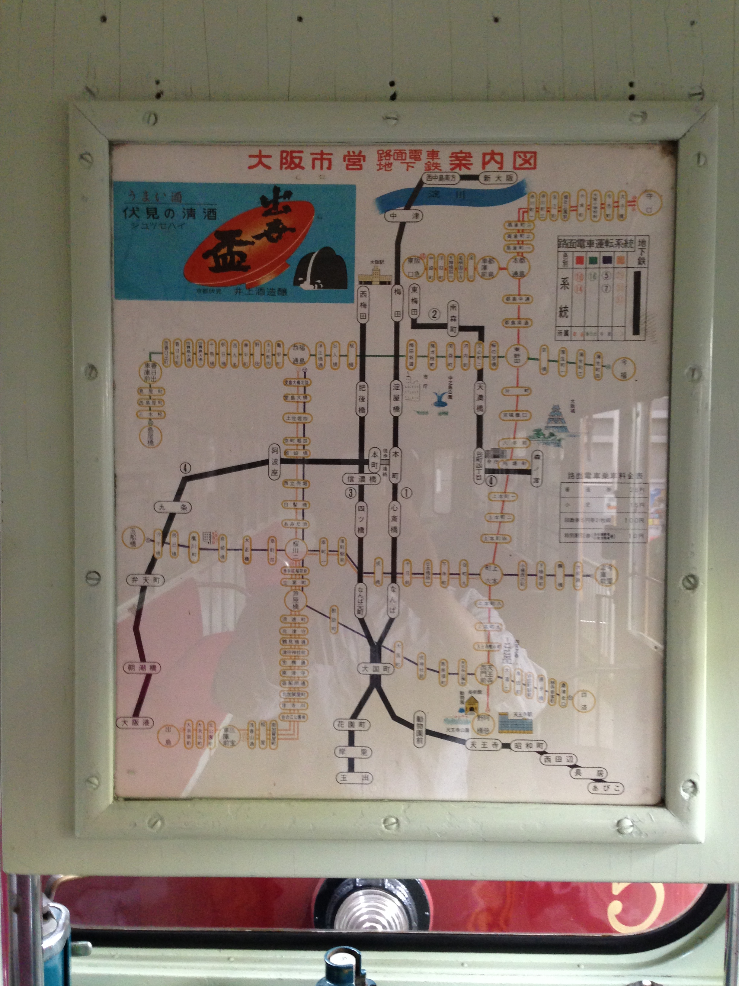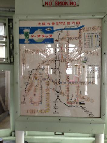 3050の車内、路線図は市電全廃直前、昭和43年頃のものと思われます。既に谷町線の一部、中央線の一部が開通していますが、堺の出島まで走る市電阪堺線(29系統)がまだ走っています。