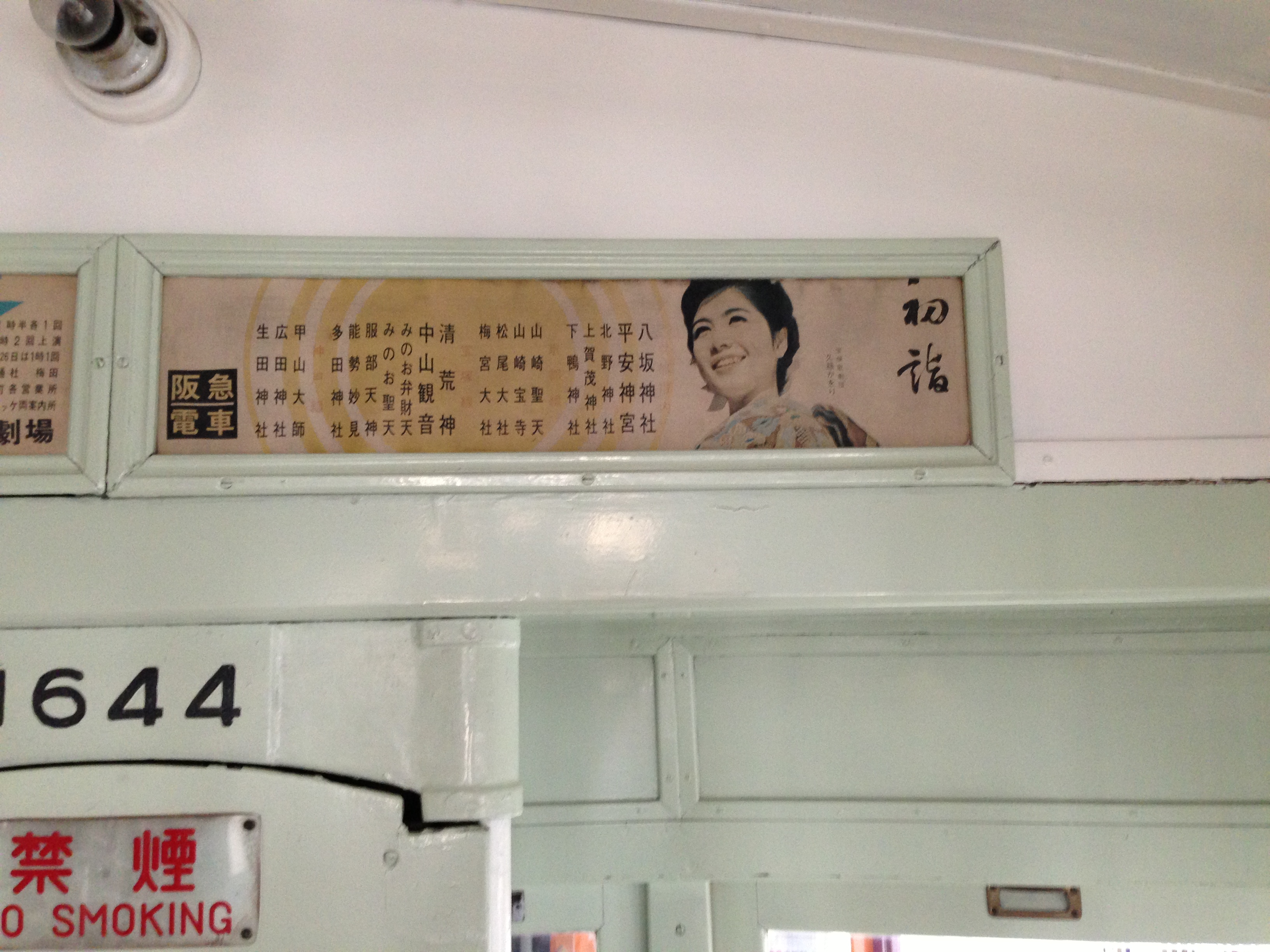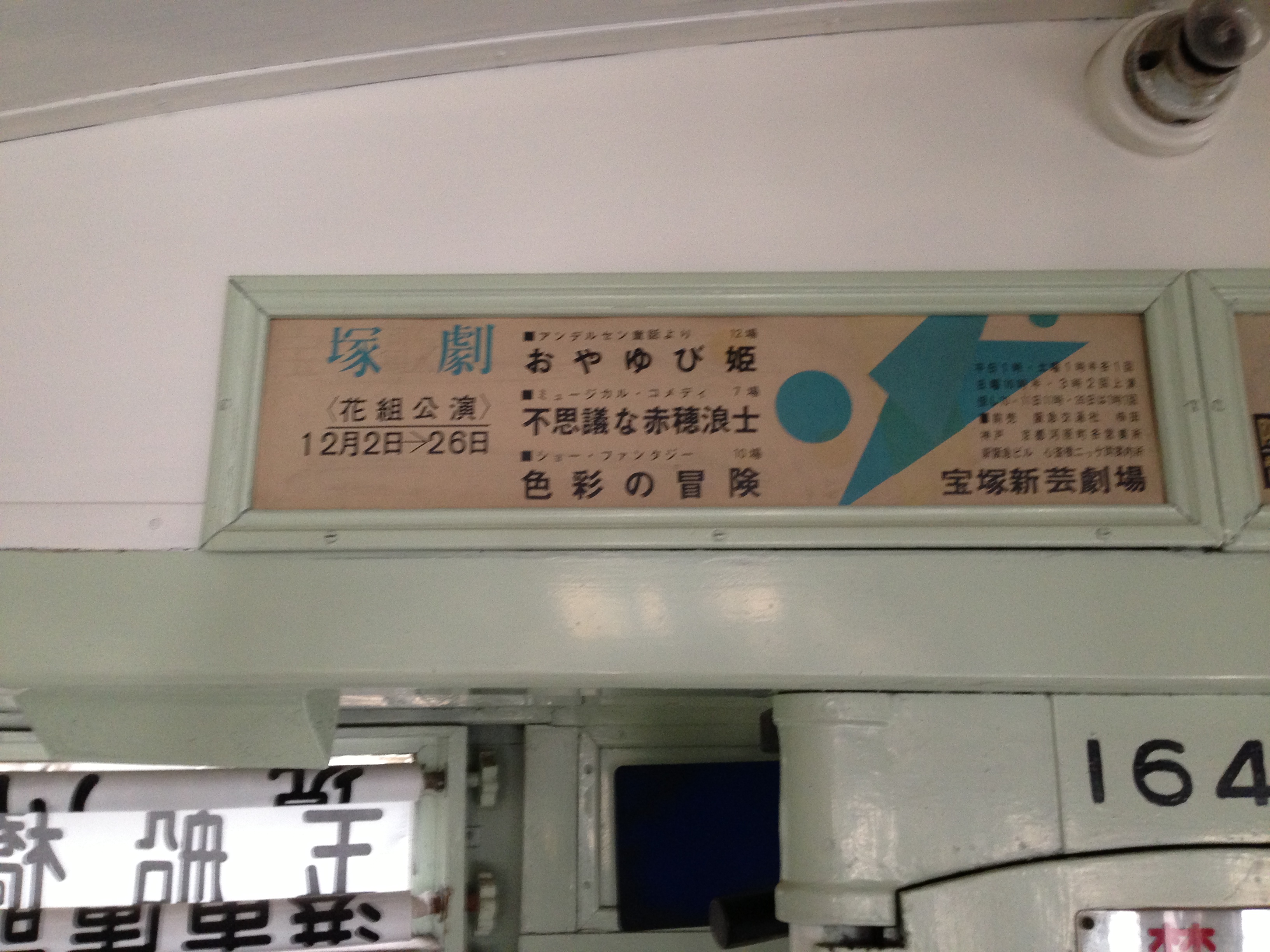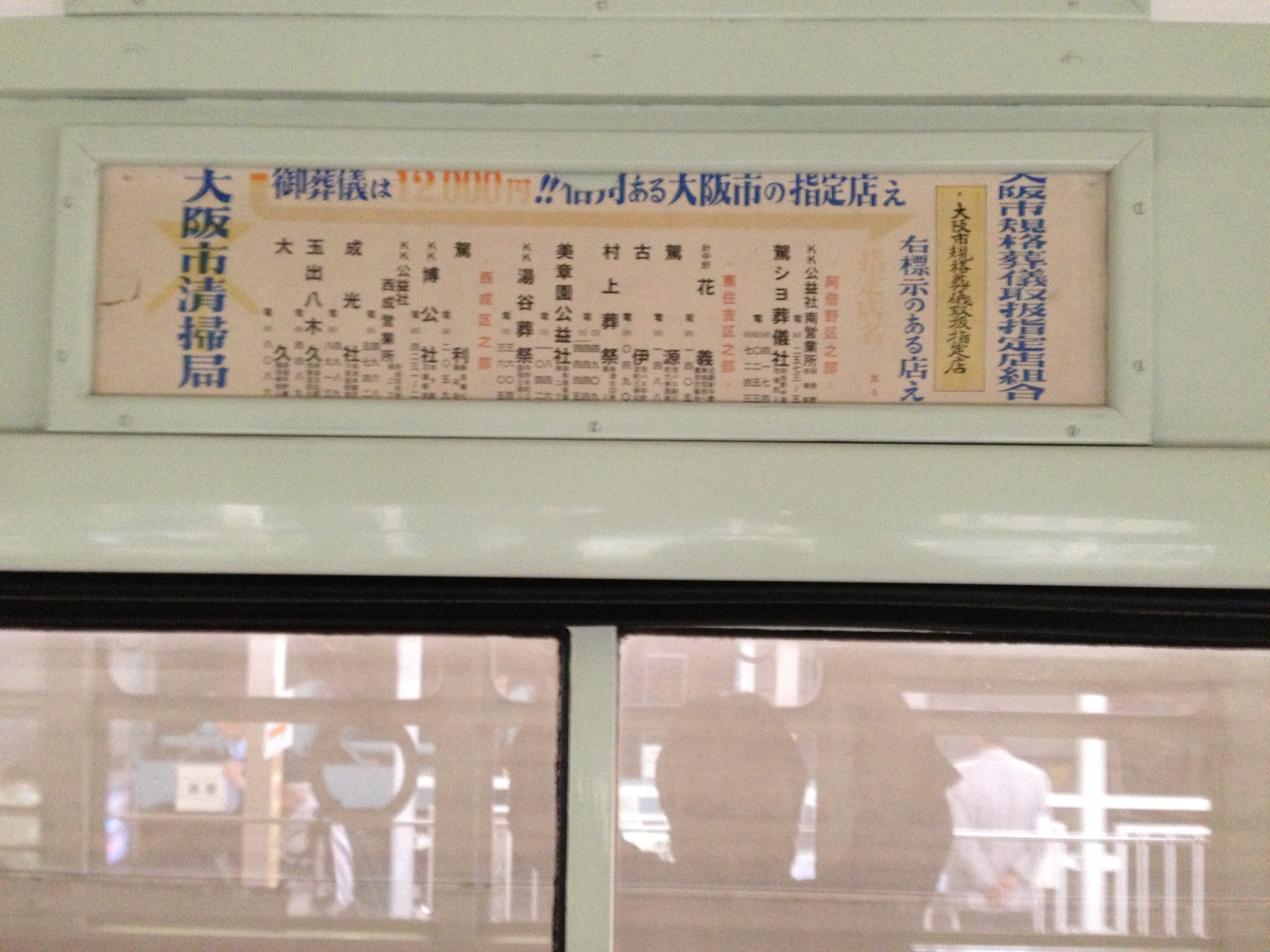 3050と1644の車内広告です。大阪市清掃局の葬儀屋案内広告はちょっとシュールです。