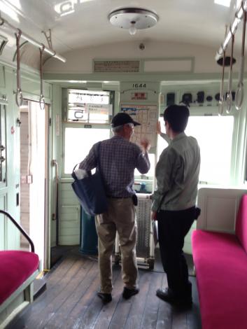 なんとも気に入ったのがこの1644号です。日除けは阪急電車みたいな鎧戸になっています。見学に来ていたおじいちゃんが職員を相手にウンチクを披露していたのですが、この1600型までが鎧戸で以降はカーテンになった、これはとても涼しかったとこのおじいちゃんに教えてもらいました。