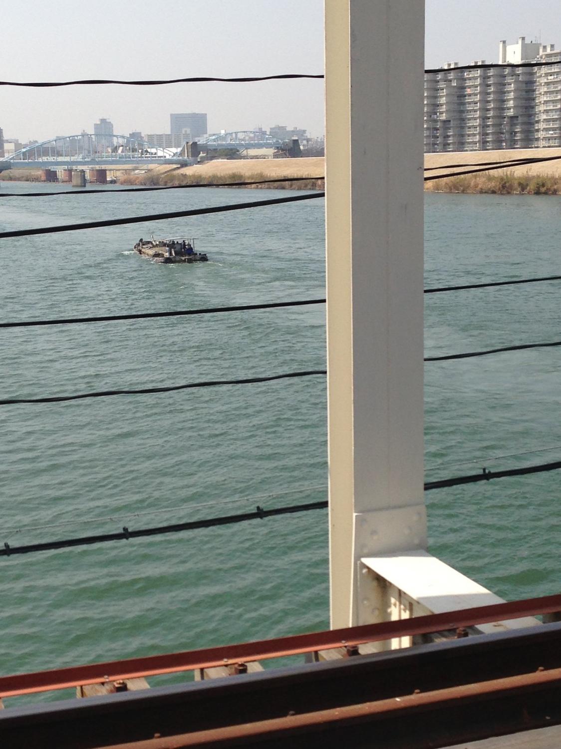 風も殆どない日で、穏やかな淀川を砂利運搬船がゆっくり走っていきます。