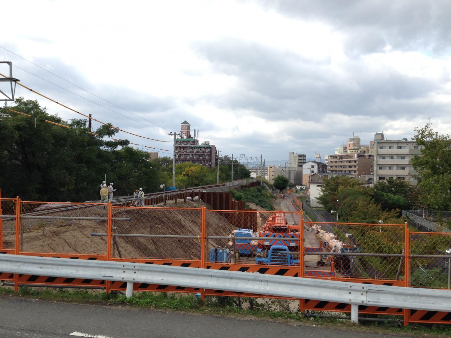 東淀川区側まで歩いて渡りました。吹田方向の築堤は切り崩され、既に複線化工事が始まっていました。