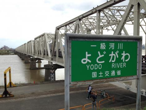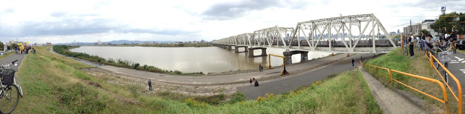 パノラマモードで撮ってみました。上流の菅原城北大橋まで、ここから約1kmあります。人道橋が閉鎖されるとその橋を通ることになるそうです。東淀川区側には淀川キリスト教病院もあり、自転車で旭区から通院するといった人たちも少なくないはずで、地域の人たちにとってはかなり不便になります。代わりの人道橋を架けるという計画もあったようですが、市の予算から見送られてしまったそうです。