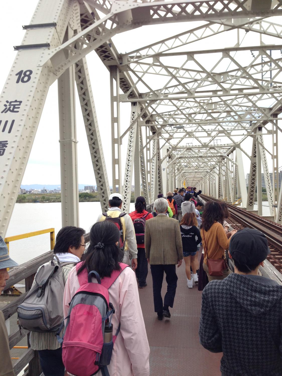 人道橋部分には鉄板が敷かれています。この鉄板の繋ぎ目のために自転車で橋を渡ると、ガタンガタンとまるで機関車の運転をしている気分になれます。淀川からの風とこのガタンガタンの音が絶妙のコンビネーションで超心地いい!
