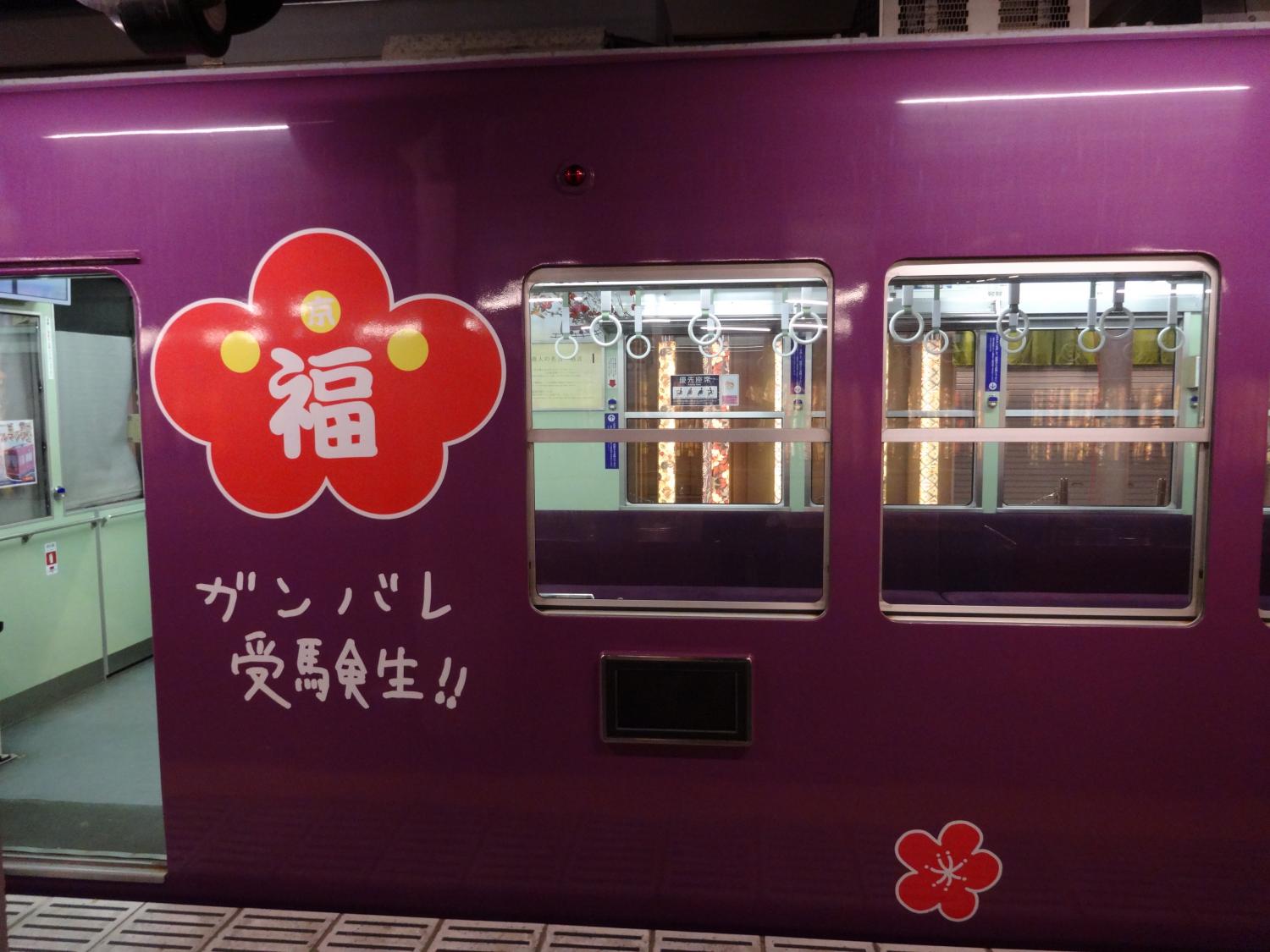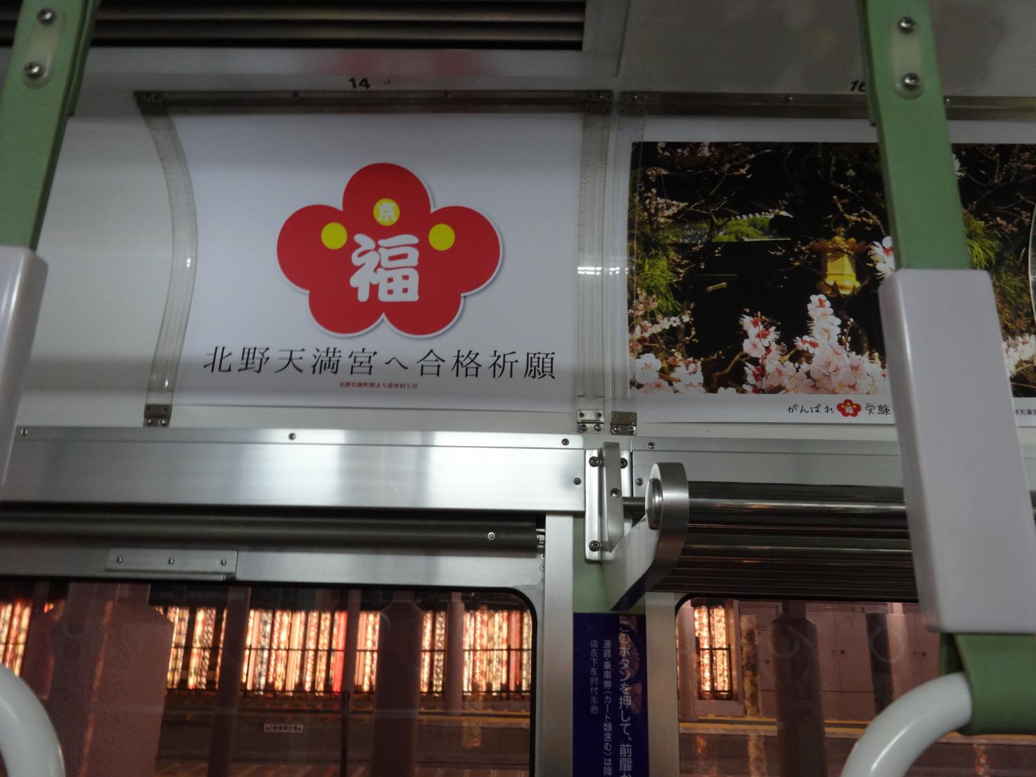 帰りに乗った「梅電車」です。どうやら北野天満宮がスポンサーのラッピング電車、車内には受験生に贈る名言・格言がいっぱい掲げられていました。