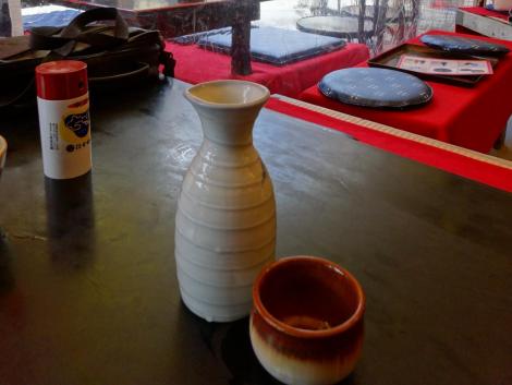 出てきたプラスチック製の湯のみでは風情がないので、熱燗を一本注文、出されたぐい呑を取り上げて「はてな」って言ったら、お店の人、しっかり分かってくれました。