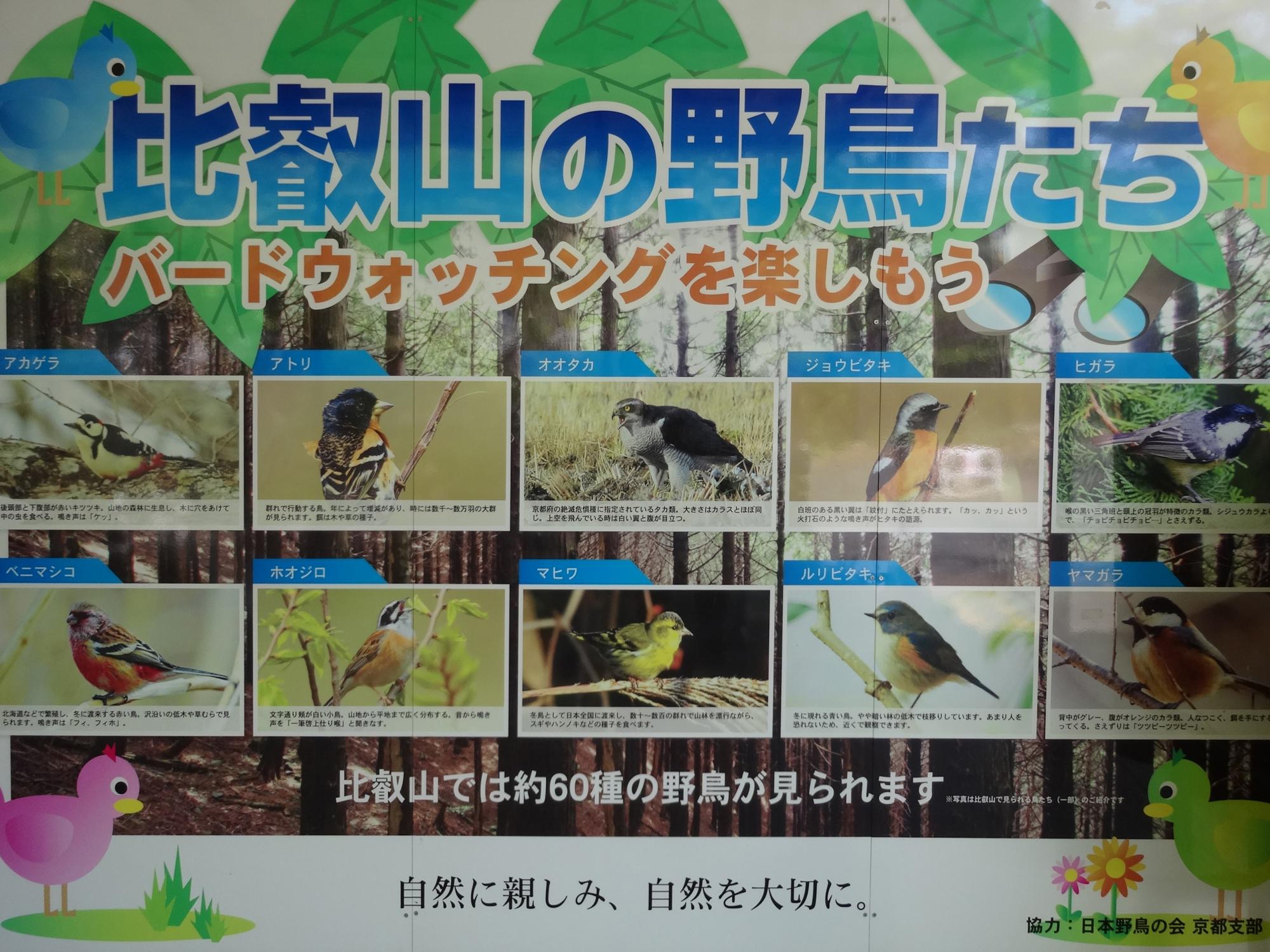 ケーブル八瀬駅にあった比叡山の野鳥たちのポスター、冬鳥の紹介が多いけど、今日はどうなのかな?