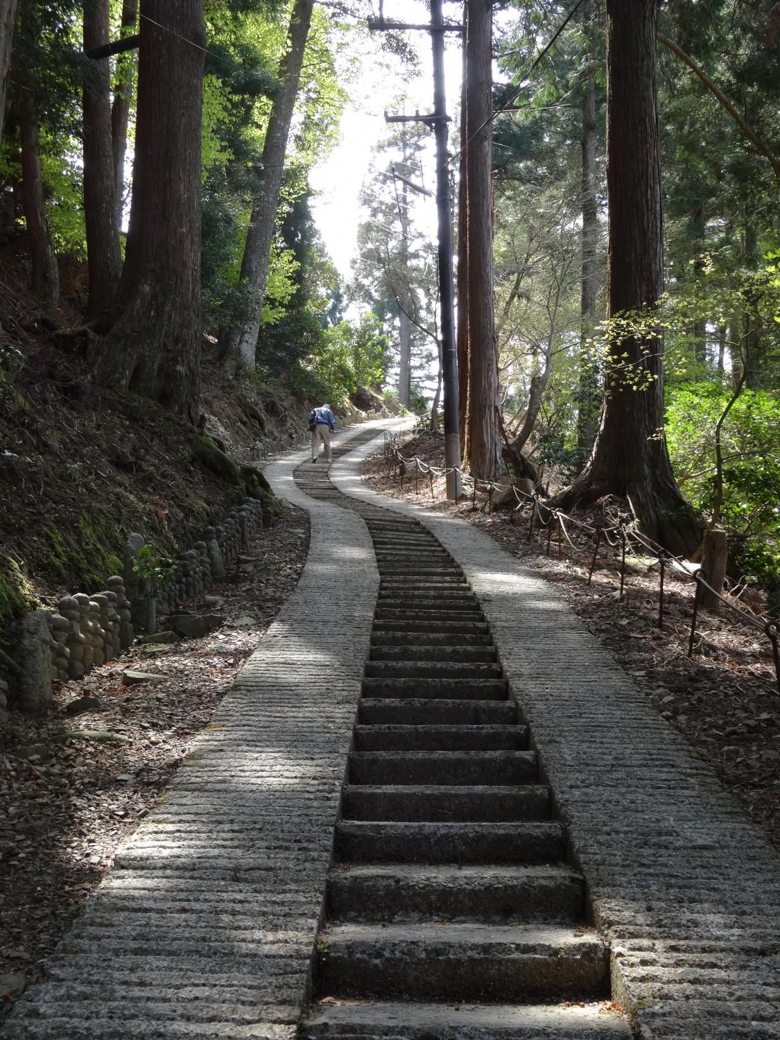 行けども行けども黒谷青龍寺にはなかなかたどりつけません。30分以上山道をあるいてかなり急な石段になりました。