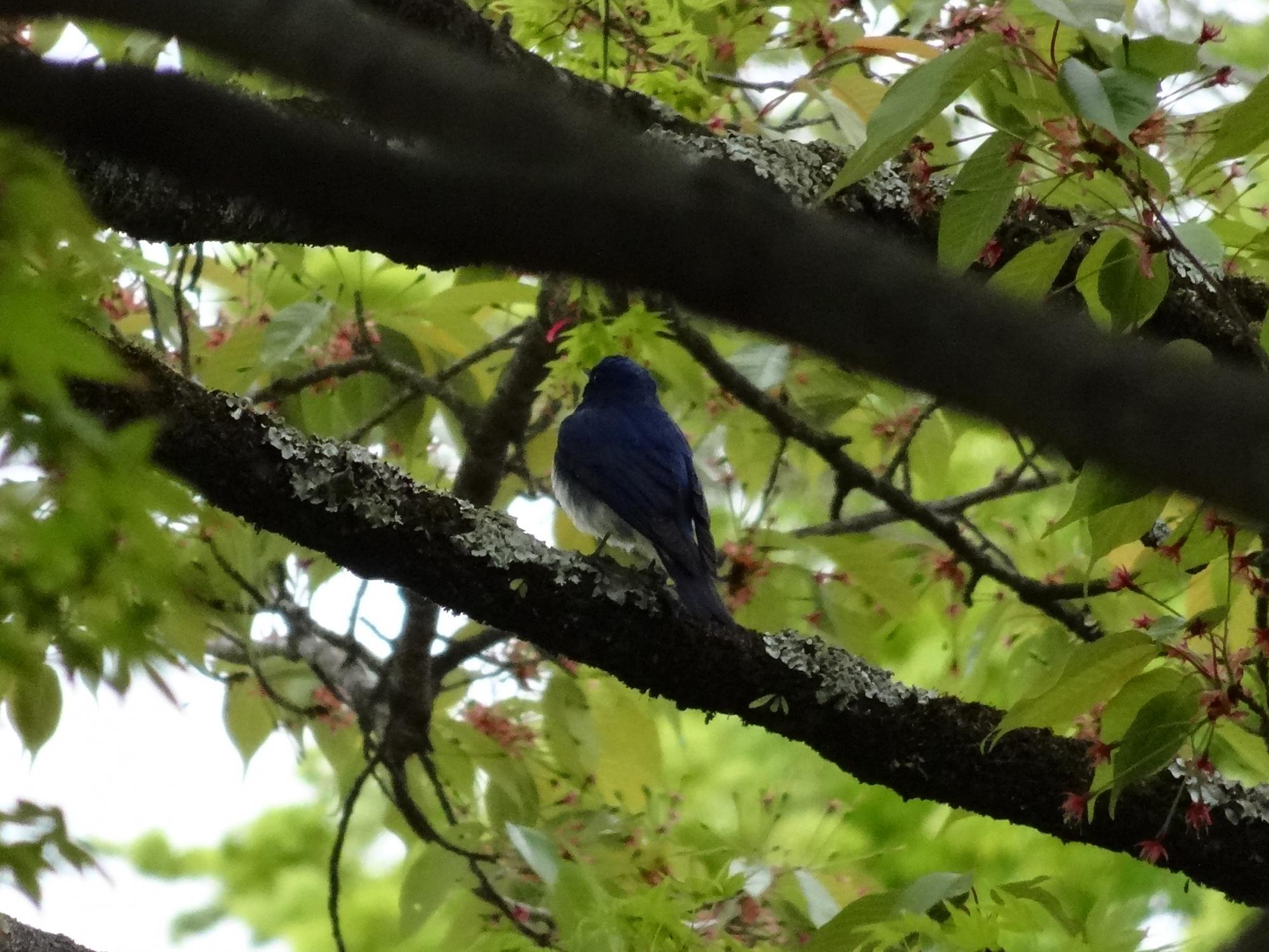 そして、別の木に・・・、やったー!オオルリ、この前は前向きだったのですが、きれいな瑠璃色の背中を撮らせてくれました。
