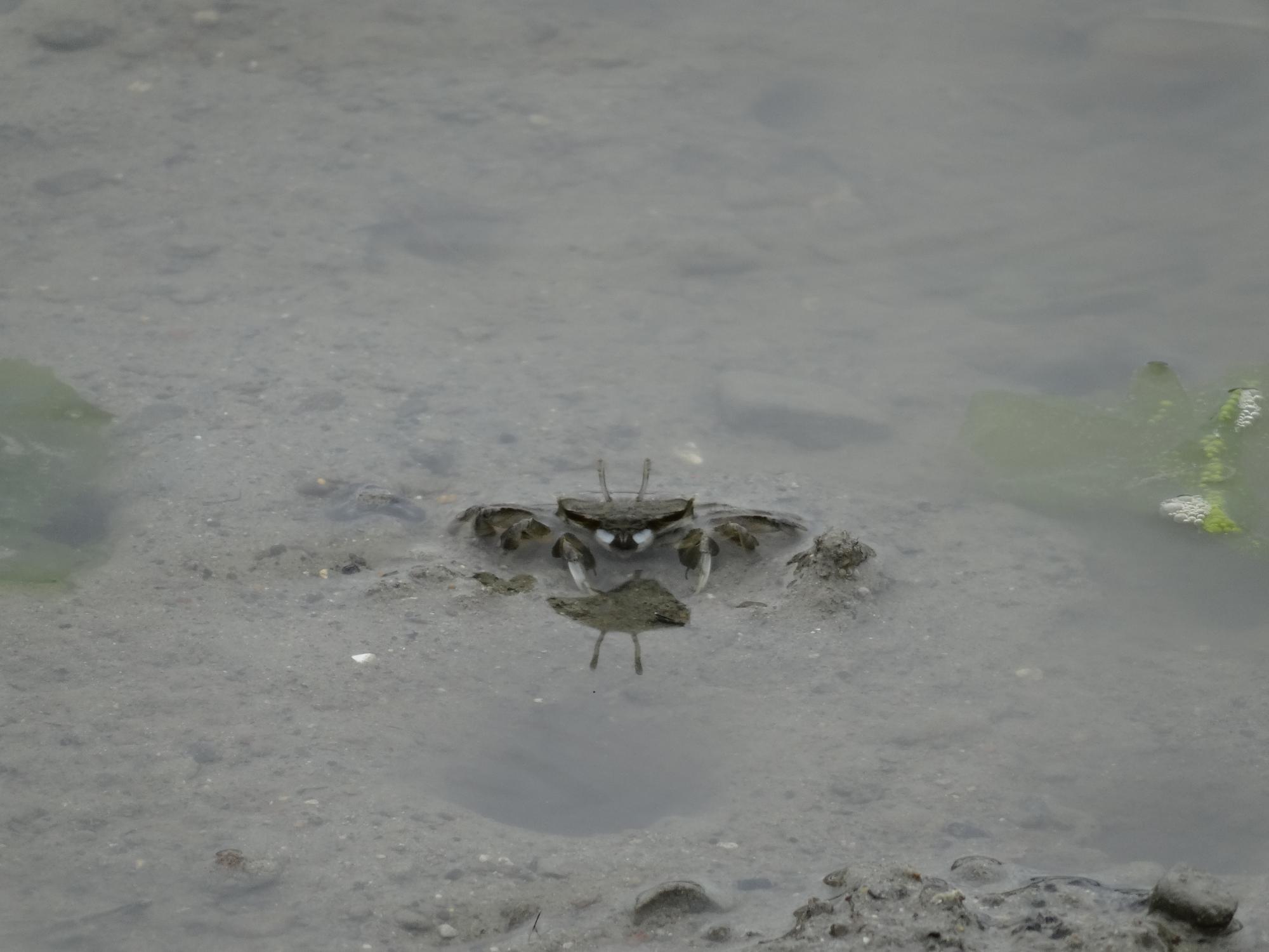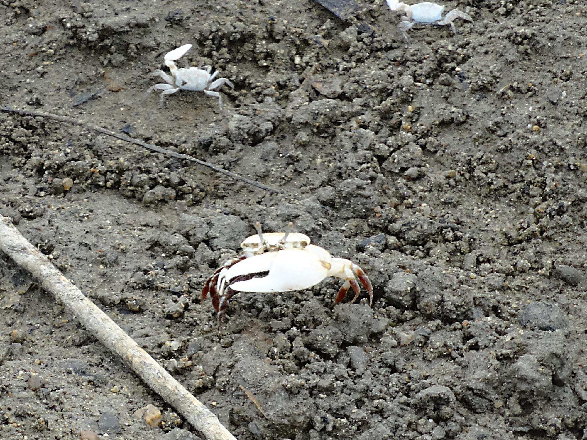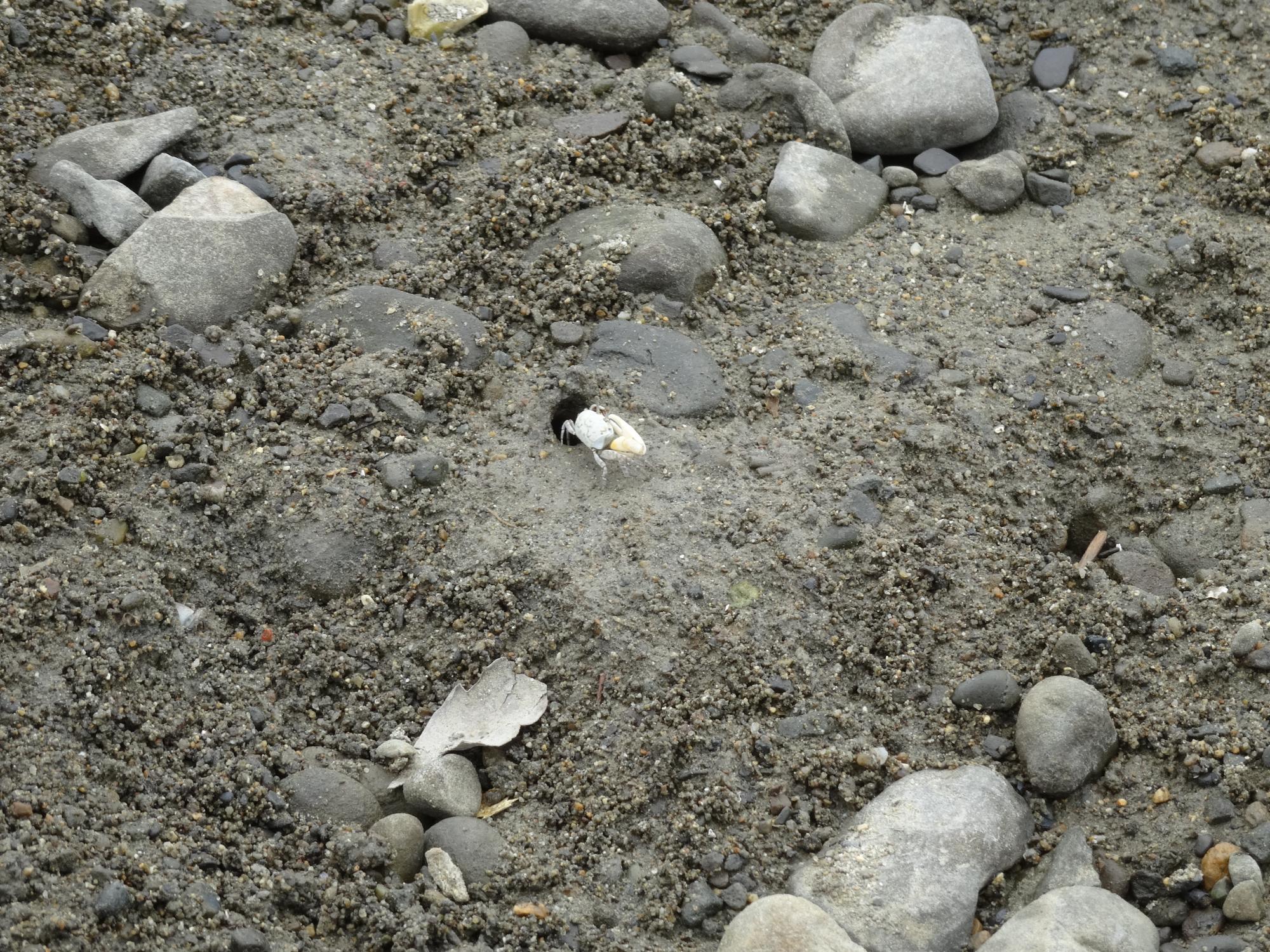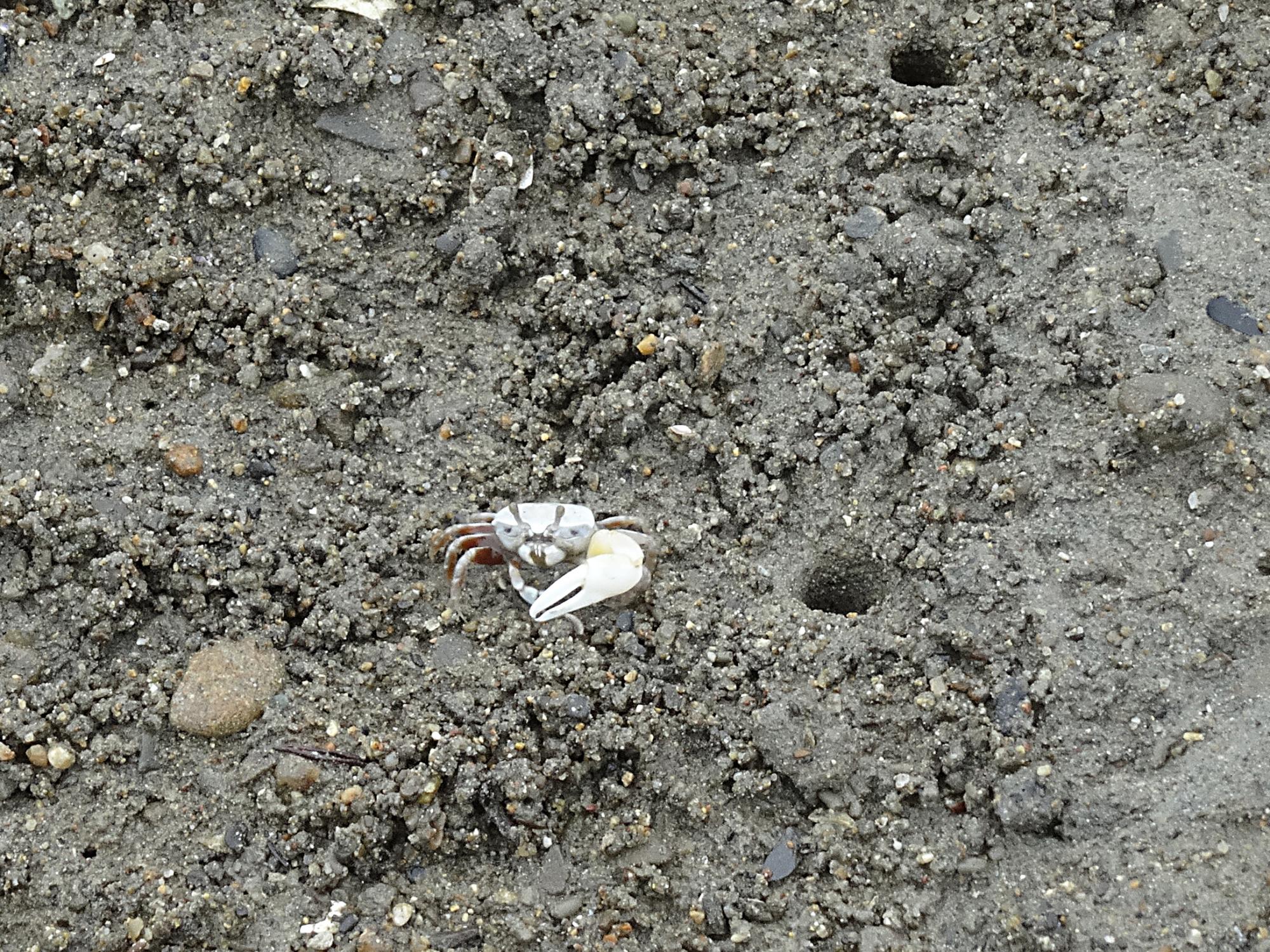 いました、いました、ハクセンシオマネキです。漢字では「白扇潮招」と書きます。左手がデカイのと右手がデカイのがいます。