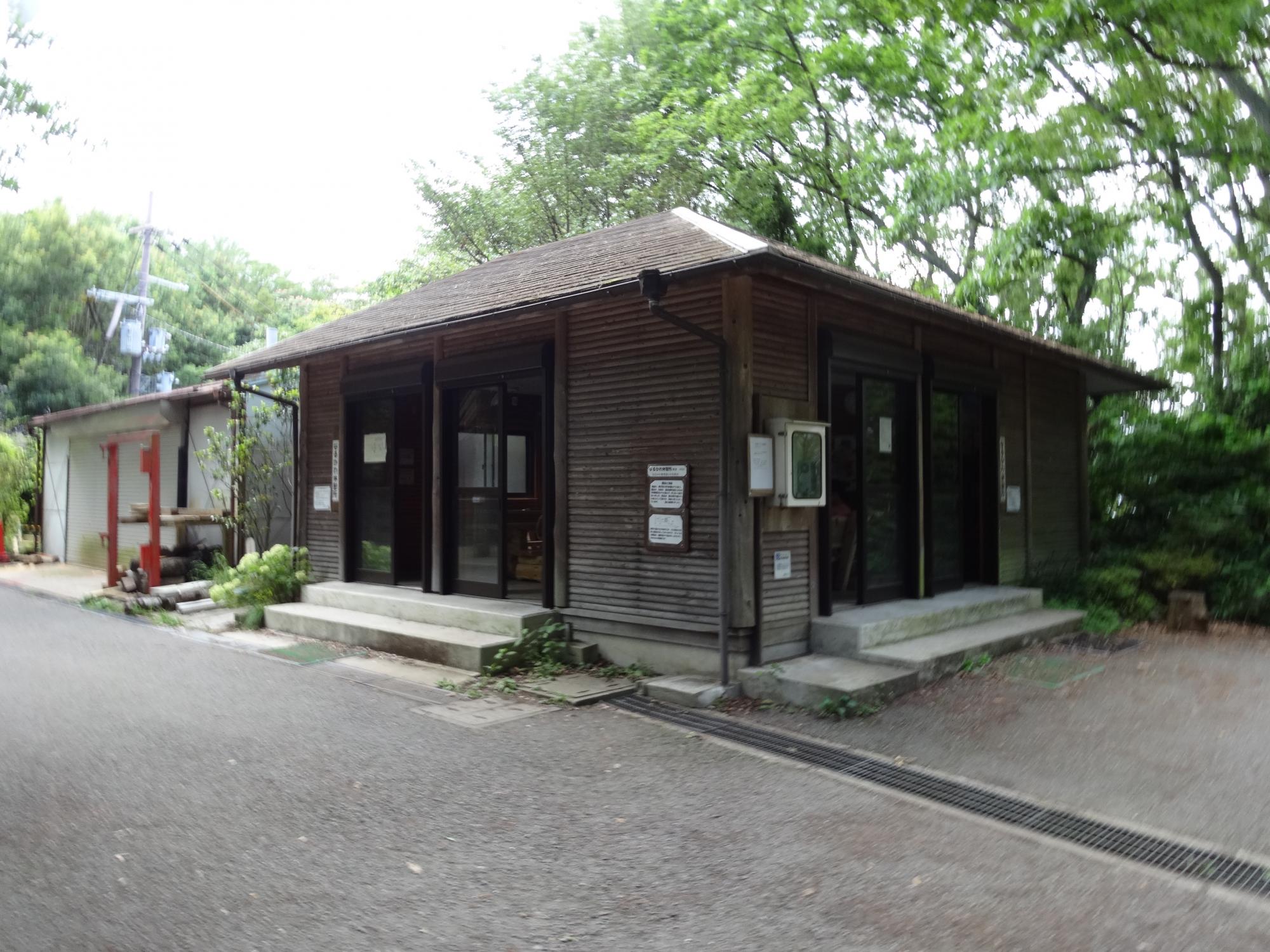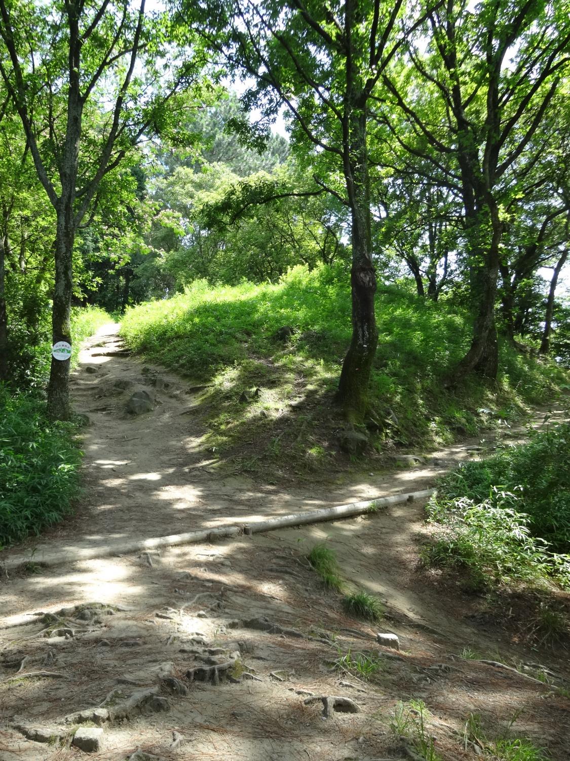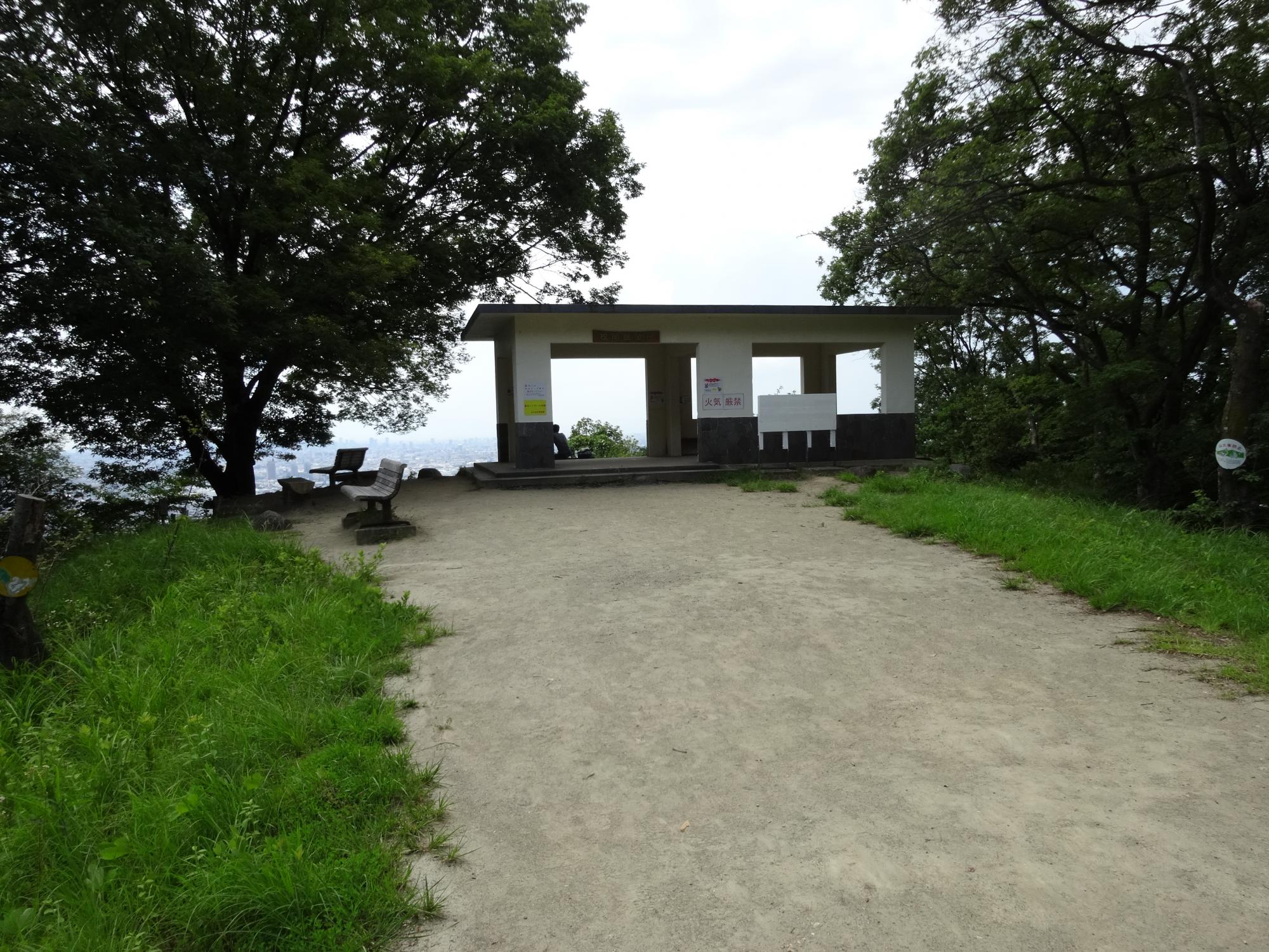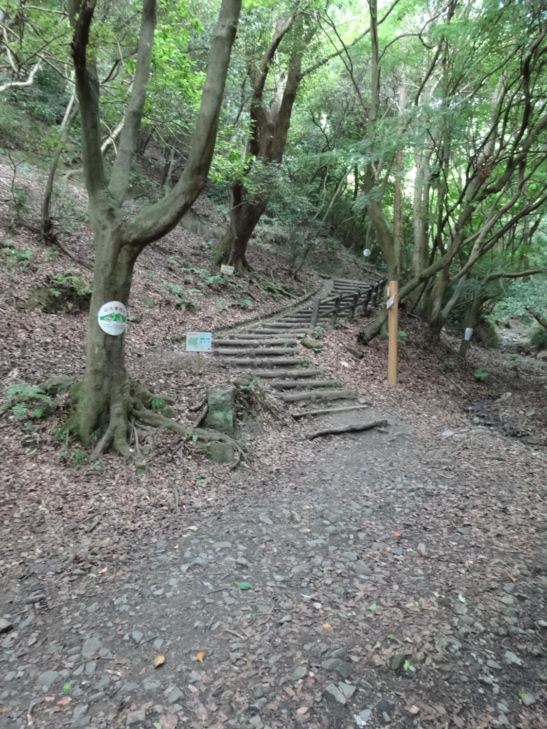 展望台は頂上ではなく、まだ上へ道が続いています。枚岡神社の創祀の地という神津嶽を越えると少し下りになって、神津嶽休憩所があります。ここで駅前の看板にあった「らくらく登山道」と合流していました。