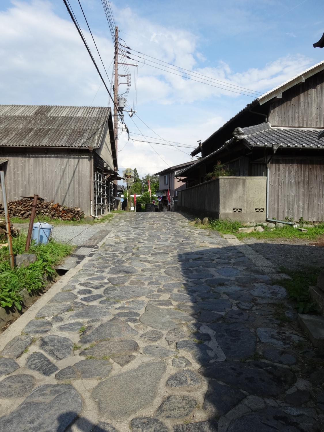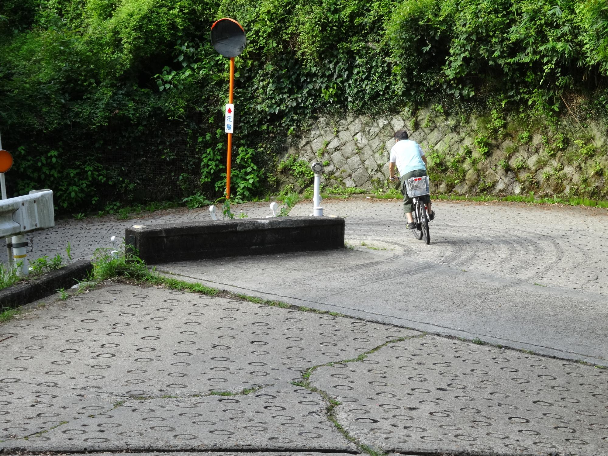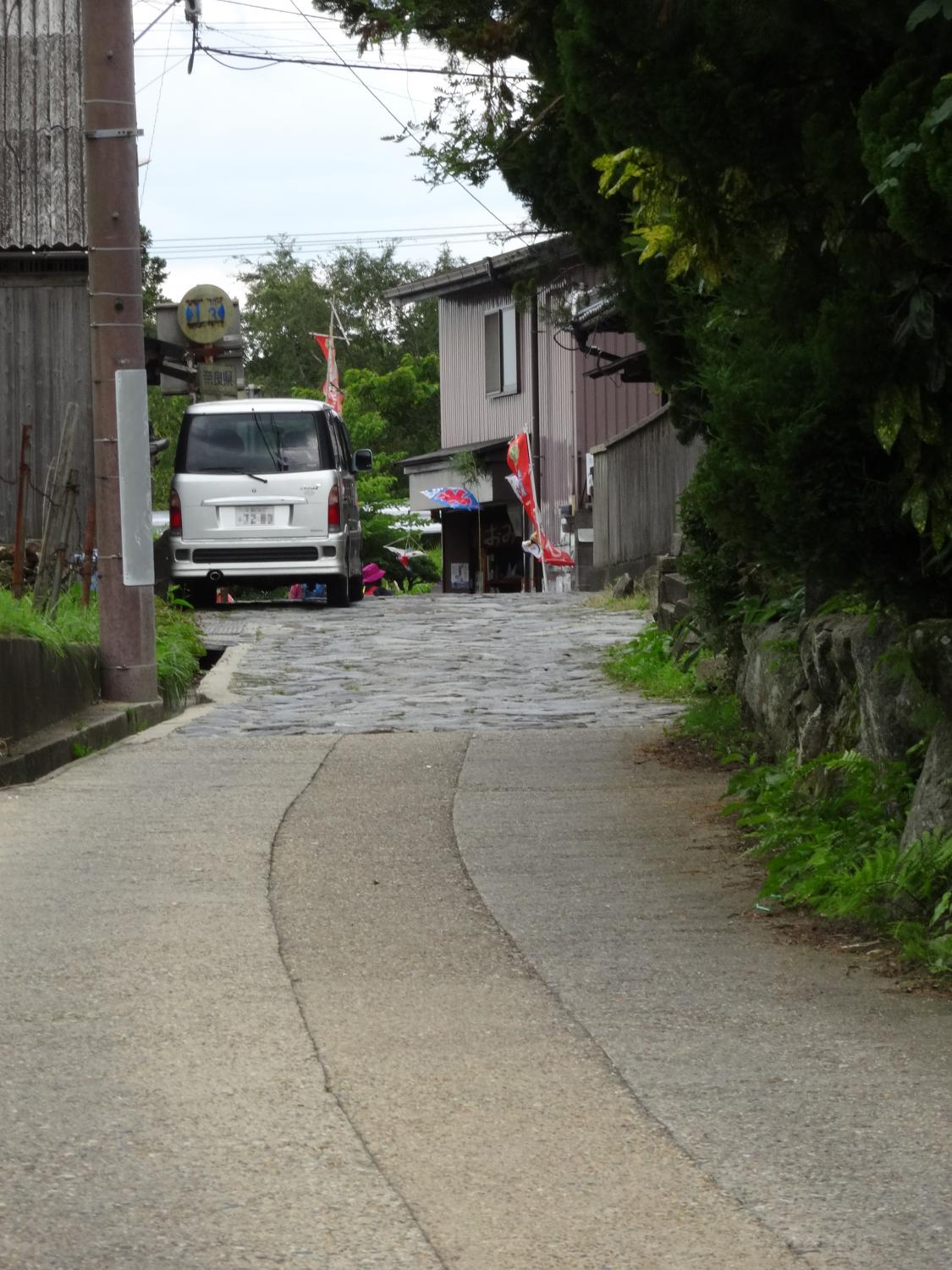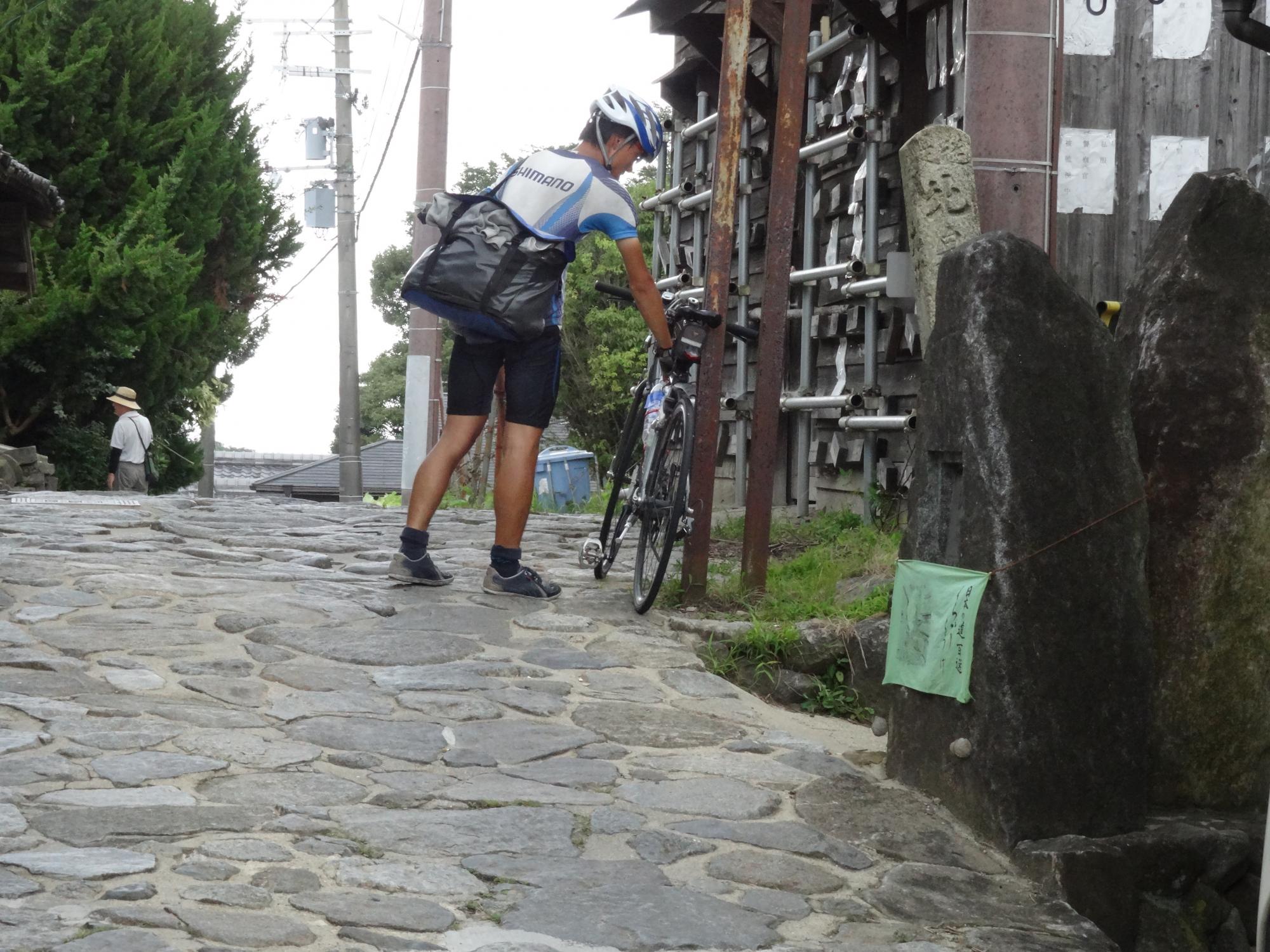 峠の頂上付近は石畳になっています。ここまで自転車で登ってきたツワモノがいました。