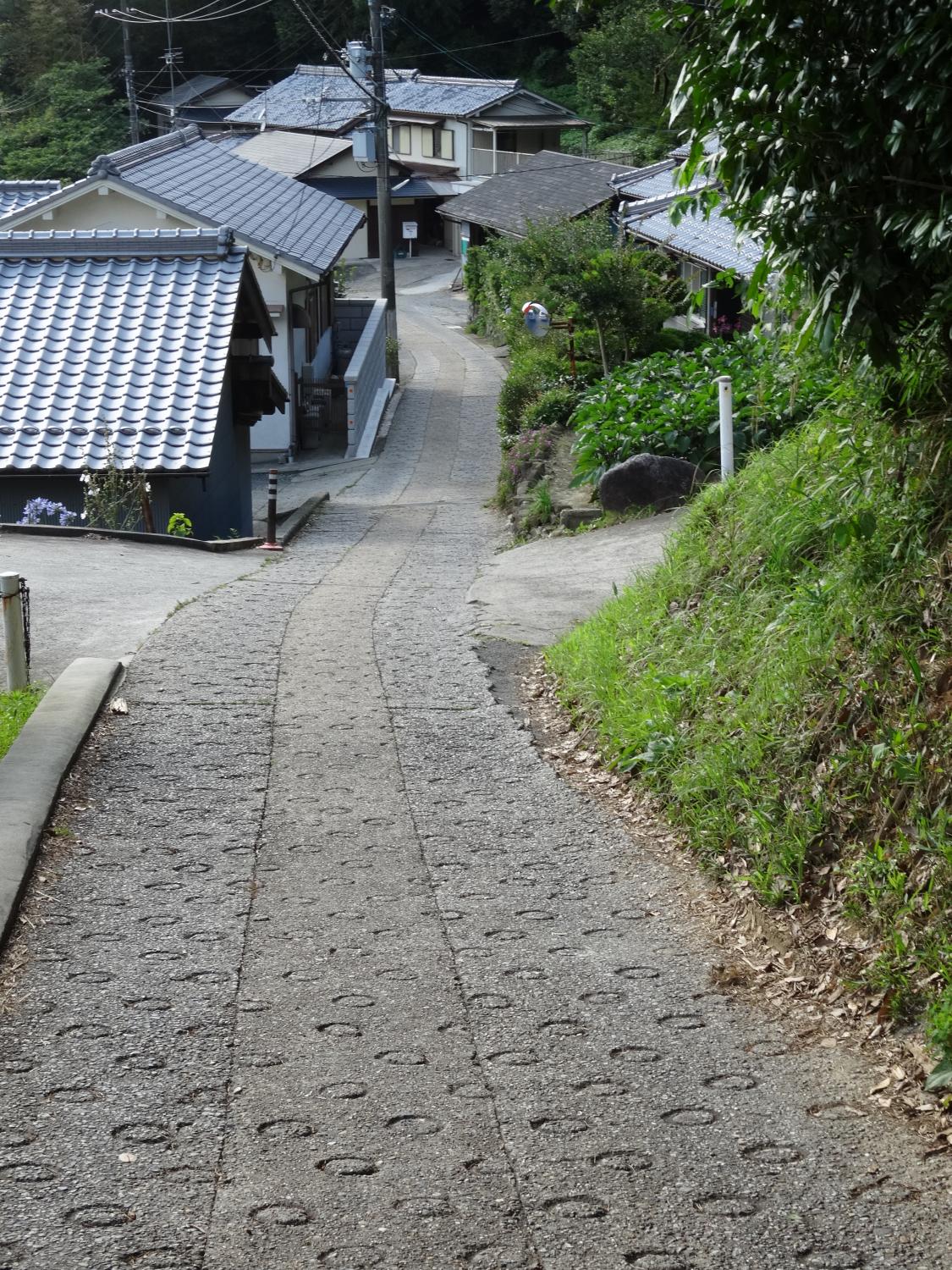 円形のすべり止めの模様で舗装された国道308号を登っていきます。