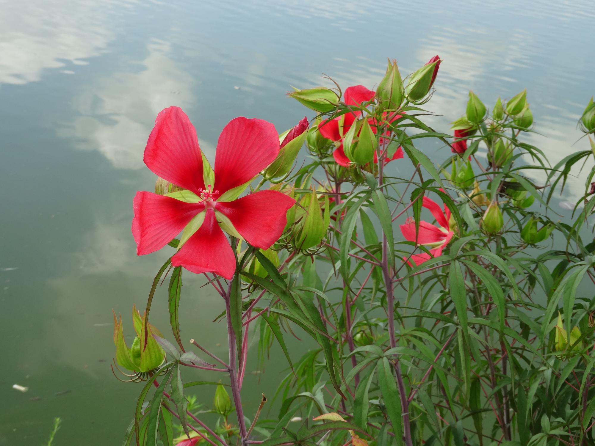 池辺に20cm以上ある見事な赤い花が咲いています。モミジアオイです。ハイビスカスの仲間で、1日だけ咲いて夕方には枯れてしまうそうです。
