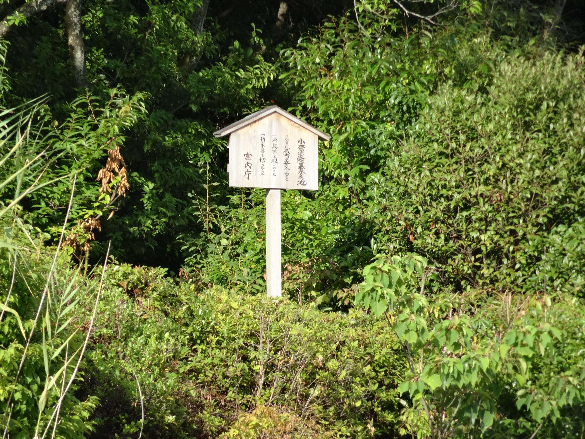 水上池の東側にある小奈辺陵墓参考地、宮内庁の立て札が立っています。