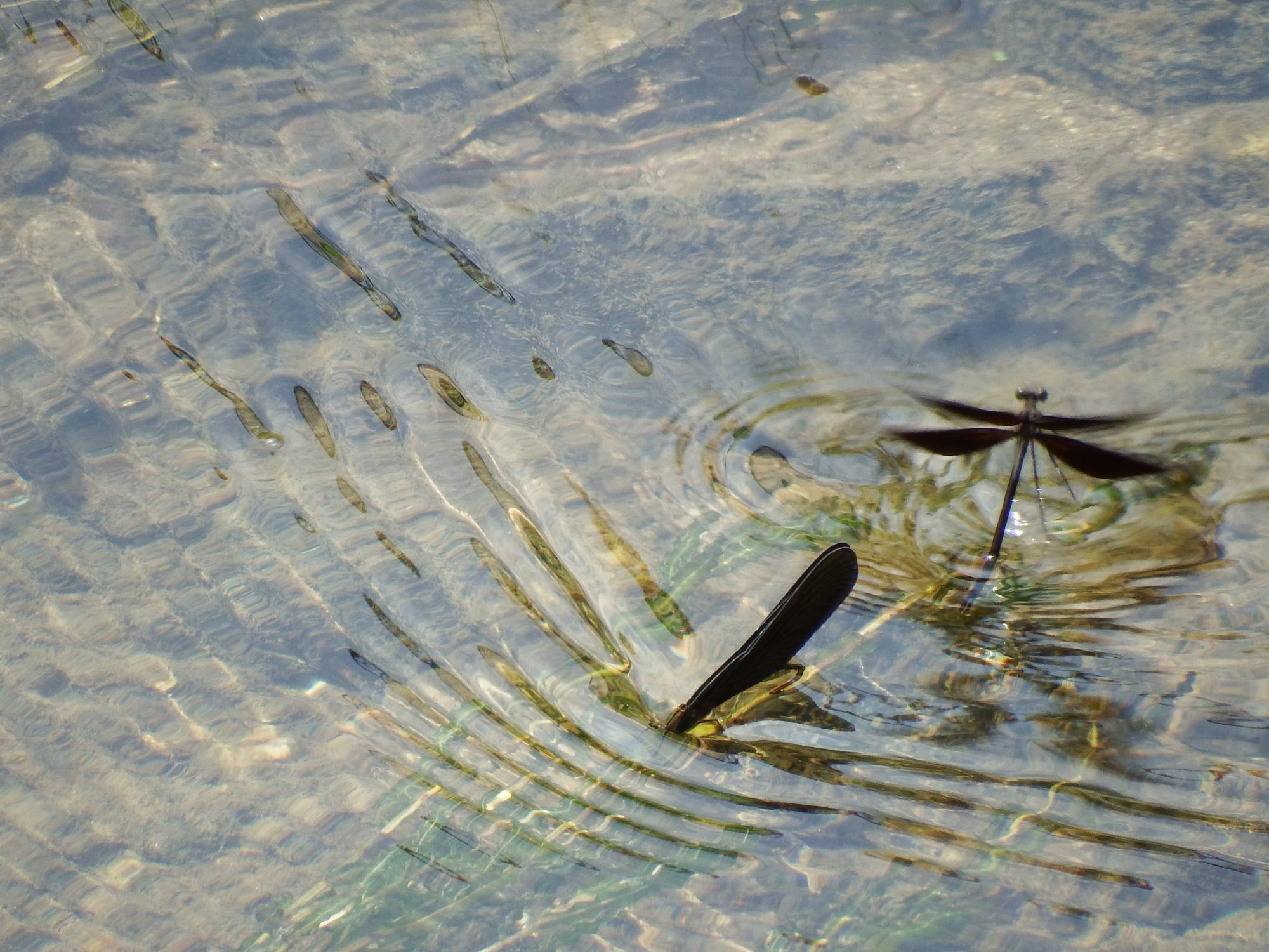 どうやら産卵の場面に出くわしたようです。♀(胴が黒)の上を♂(胴が緑)が心配そうに飛んでいます。