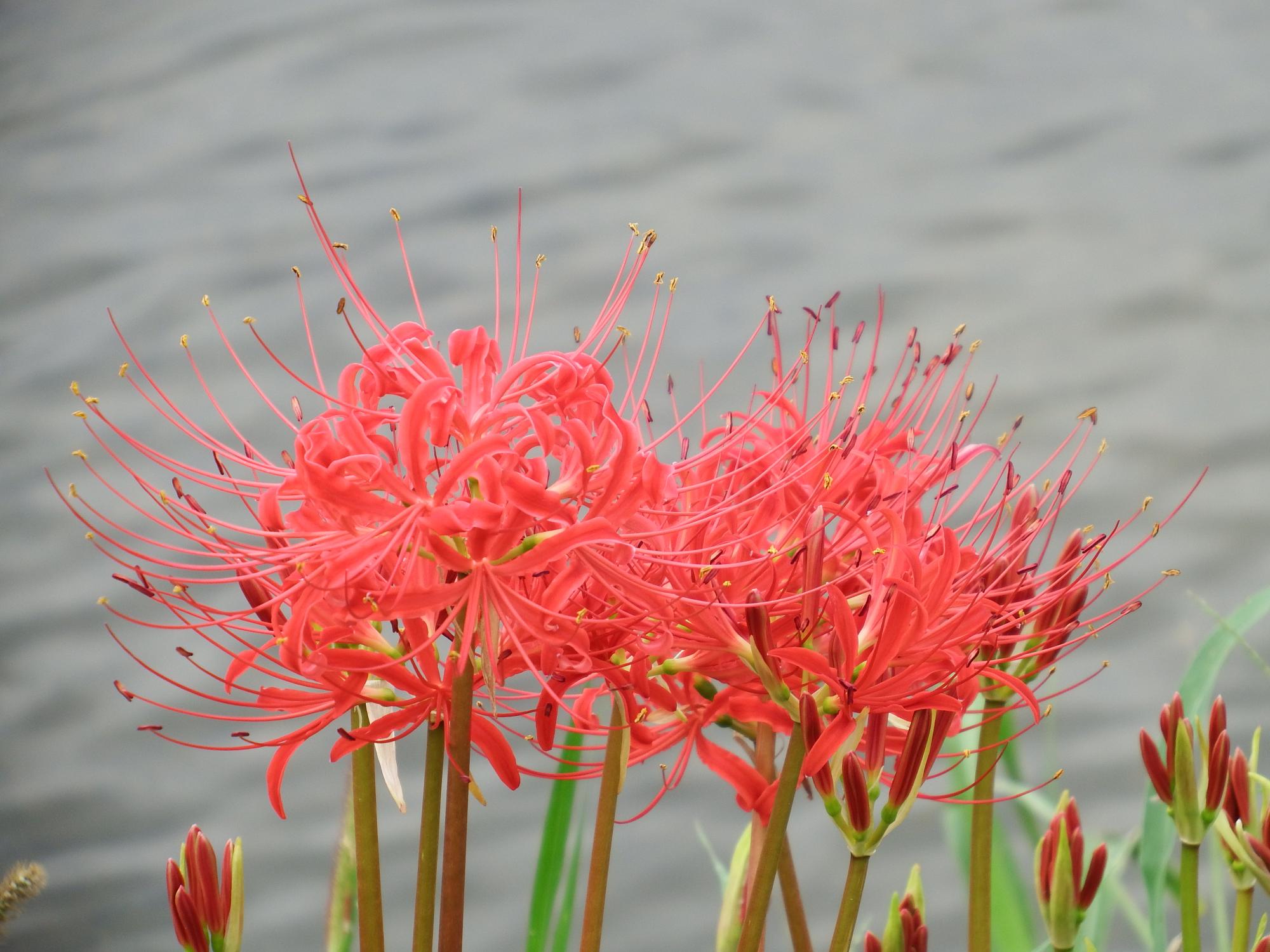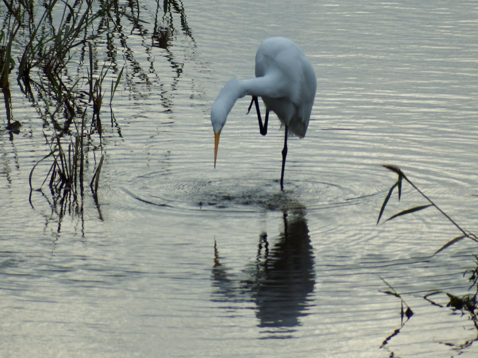 初瀬川と名を変えた大和川の土手にはヒガンバナ、川の中ではダイサギがコツコツとやってます。