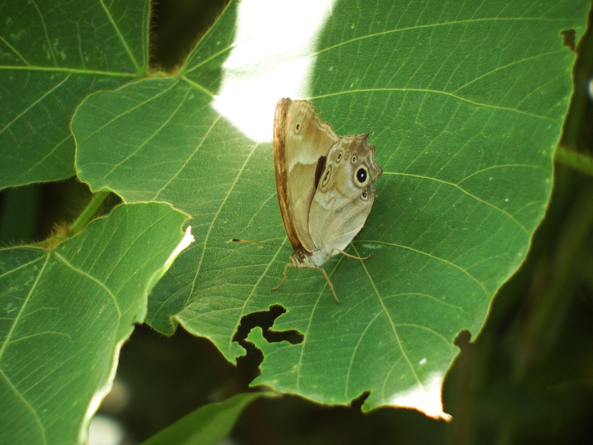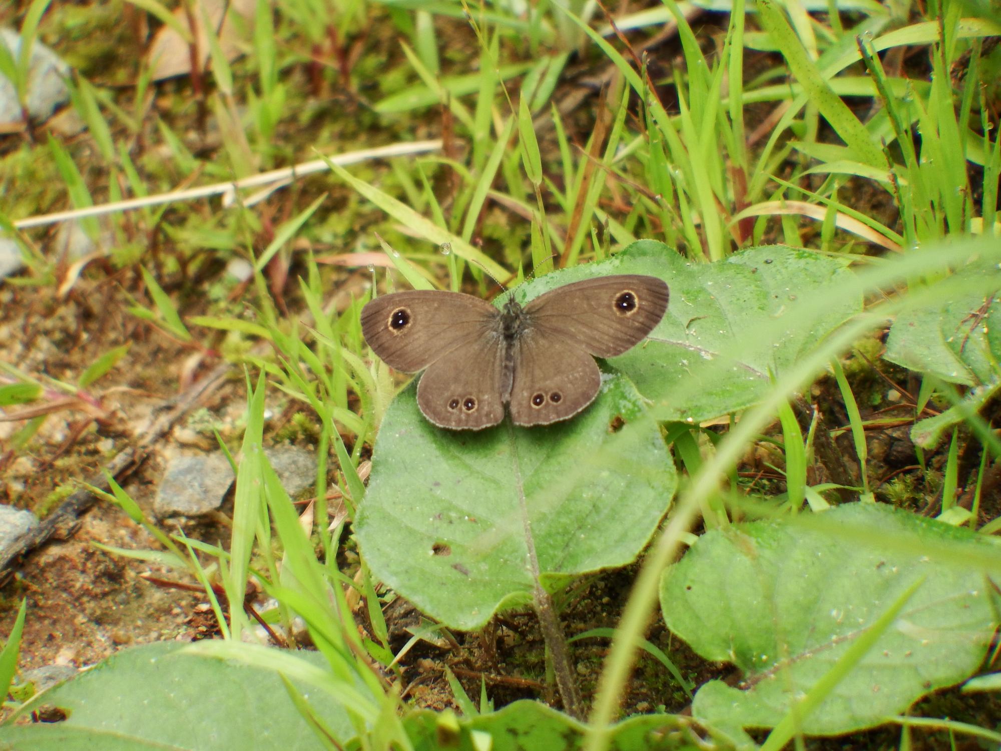 ヒメジャノメに似ていますが、翅の後ろがギザギザのヒカゲチョウです。目の前の葉っぱの切れ込みはこの子が食べた跡ではないでしょうか?