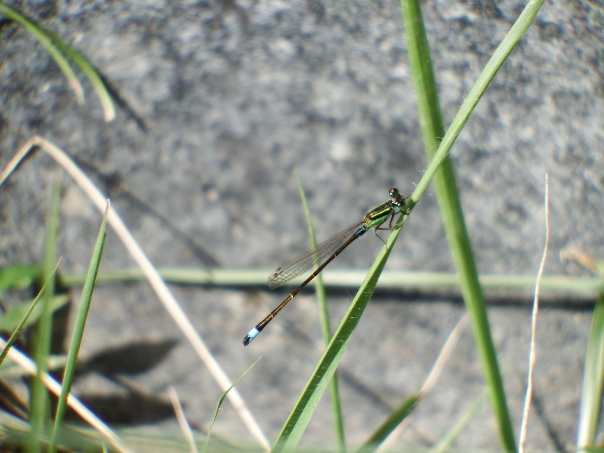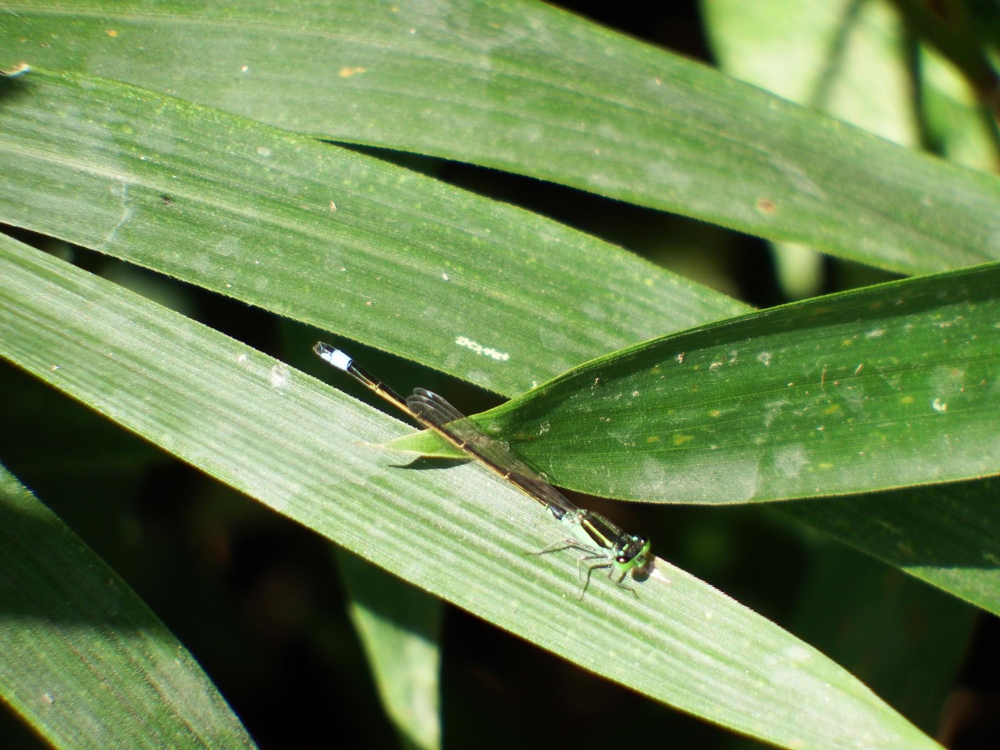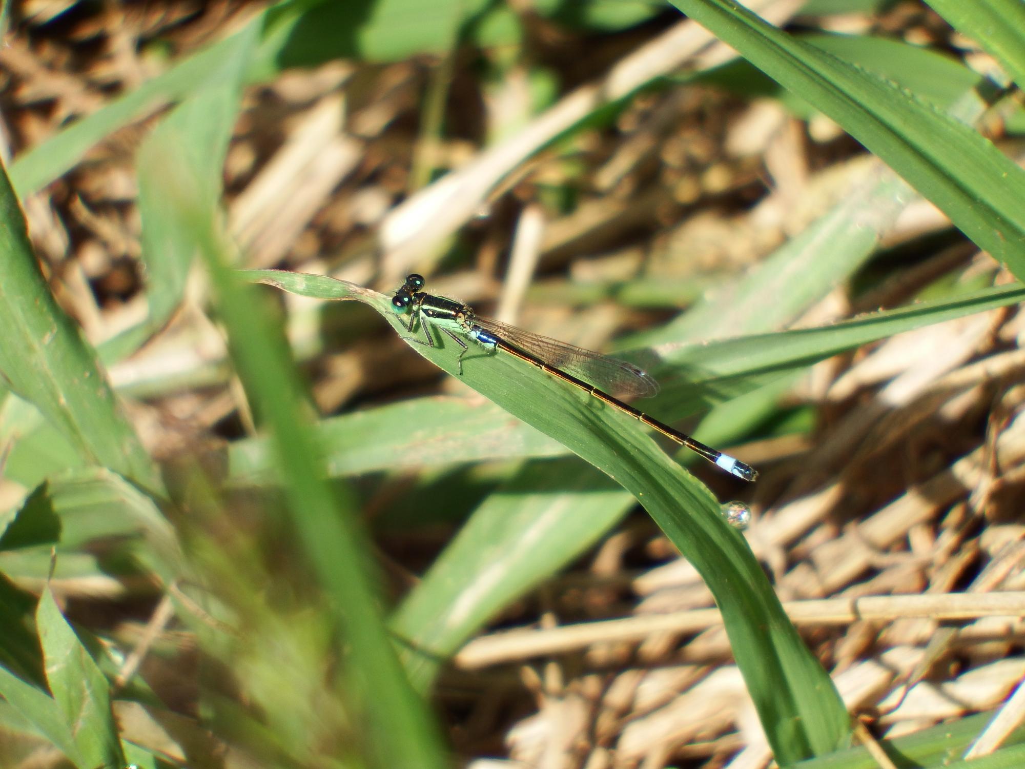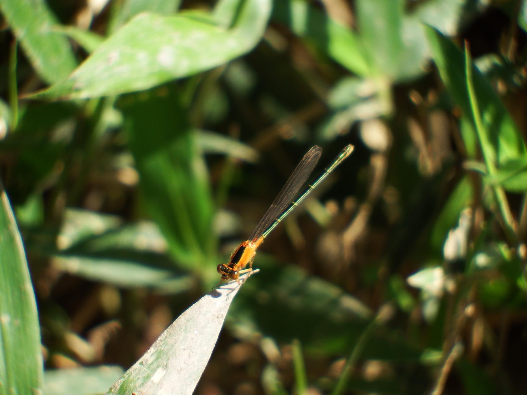 ハイキングコースというよりただの農道みたいな池の廻りの道を歩いていたら、いました、いました、大阪城ですっかりお馴染みになったアオモンイトトンボです。