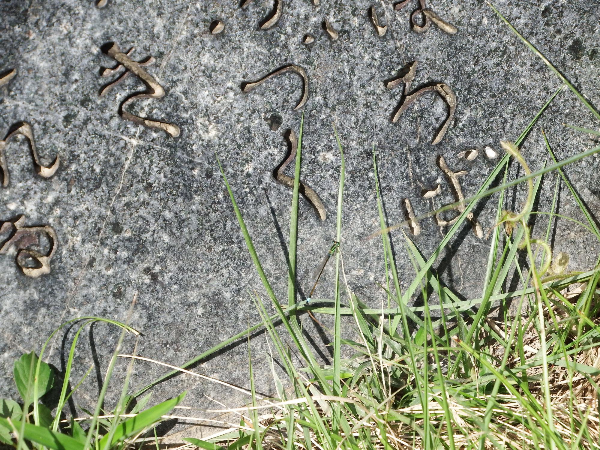 碑文の前にアオモンイトトンボがやってきました。「どうだい、ここ、まほろばだろう」と自慢しているみたいです。