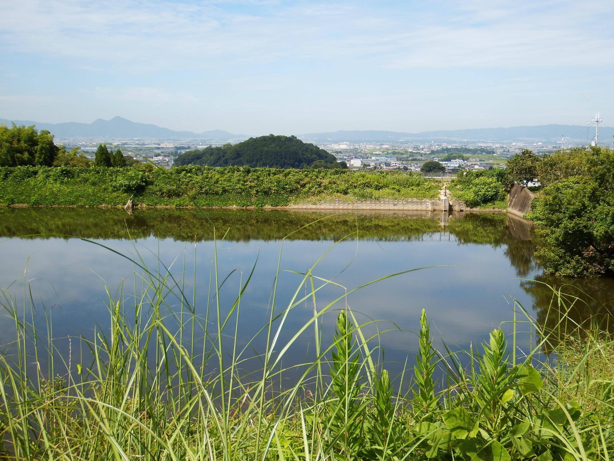 西側の池の向こうに大和盆地が広がっています。「青垣 山ごもれる」なかで、遠く二上山も望める絶景ポイントです。