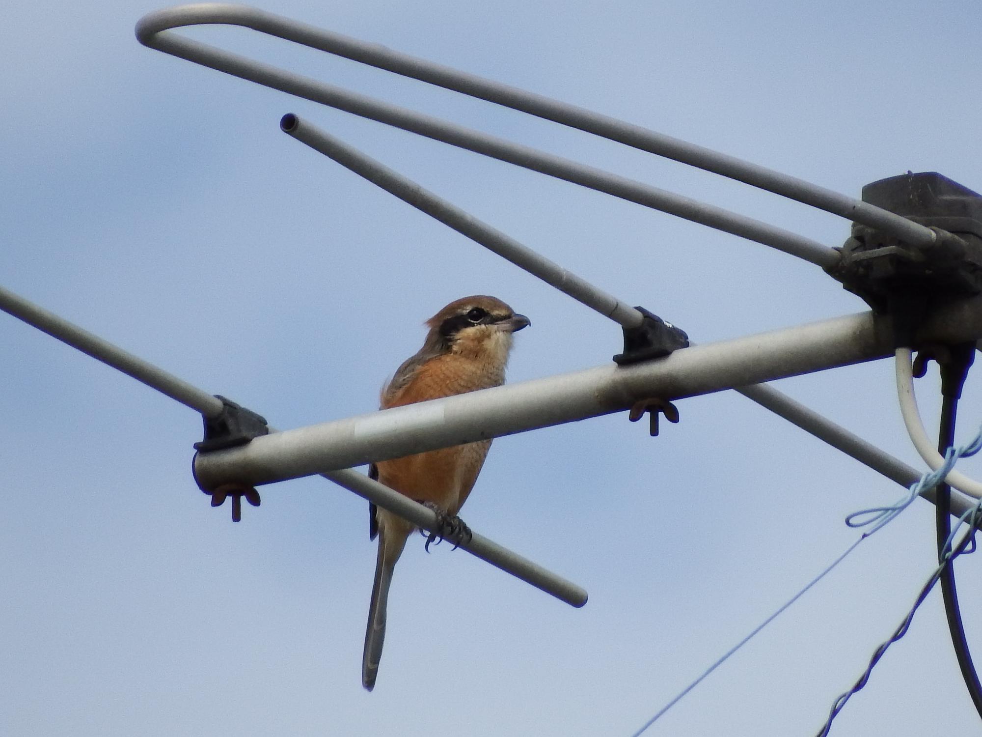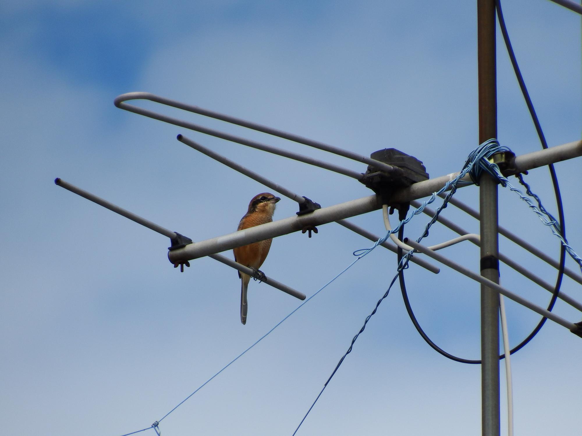 古い家だけでなく新しい家も交じるところ、アンテナにモズ!かなりいい感じで撮れました。