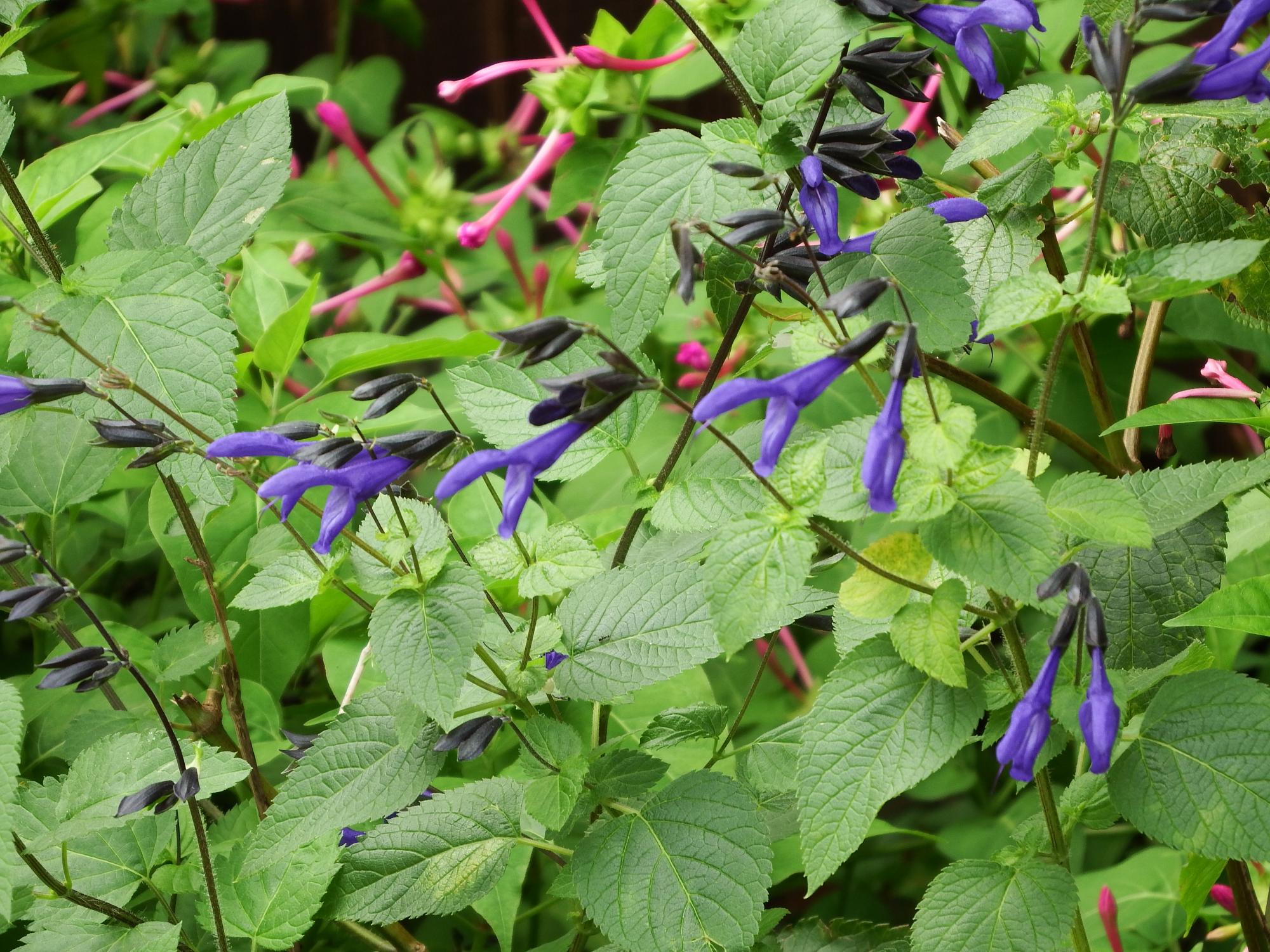 順にメドウセージ、トレニア、キクイモです。調べるの苦労しました。