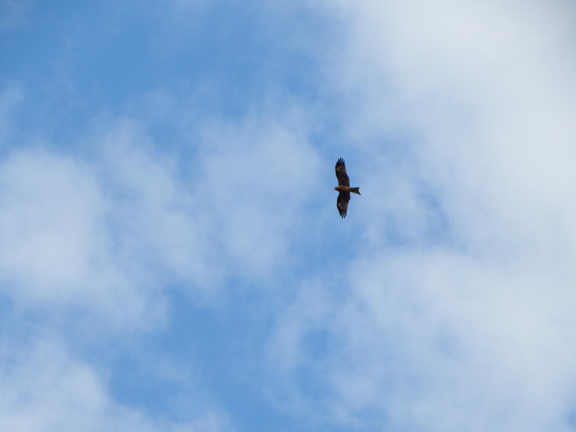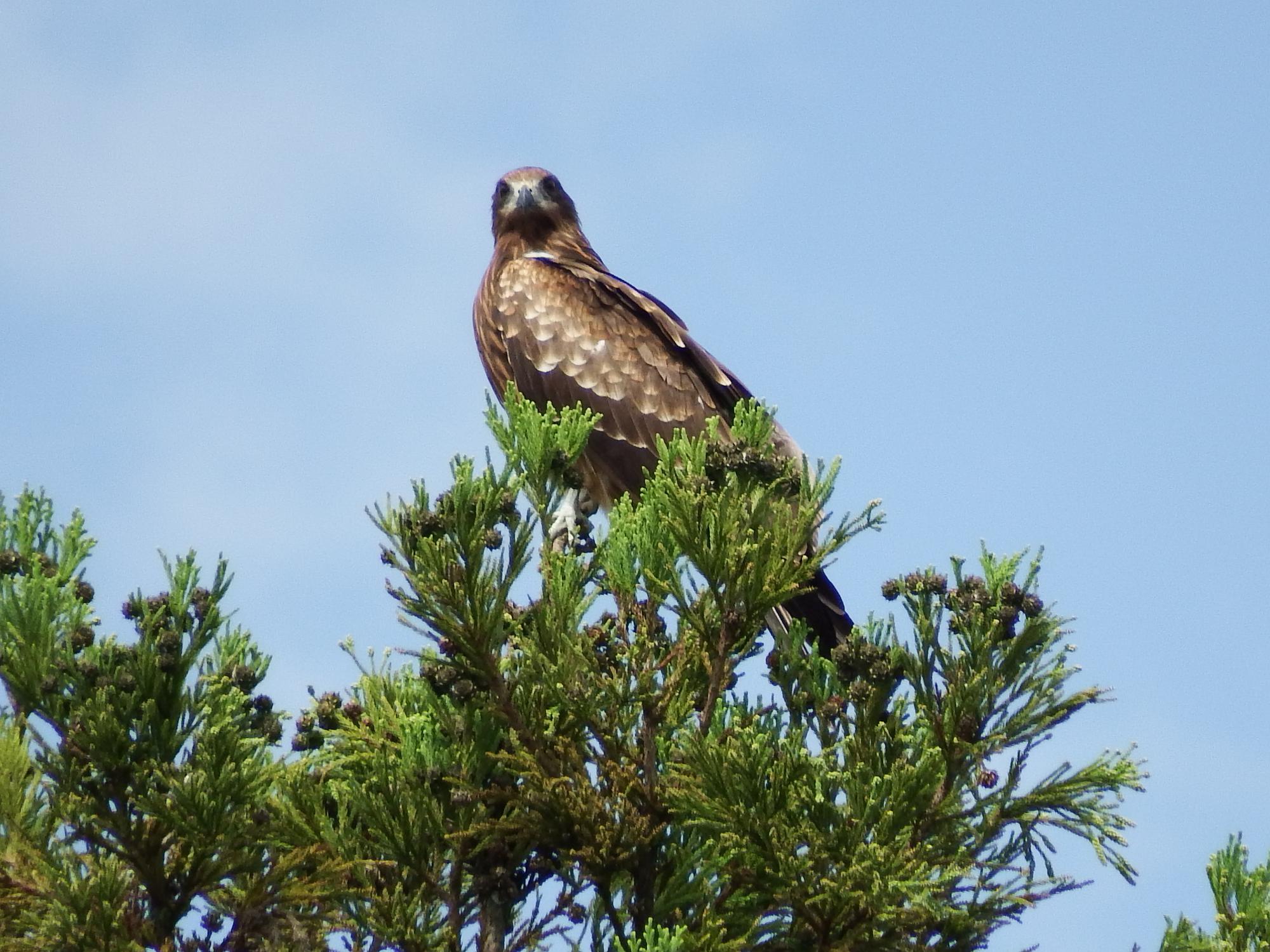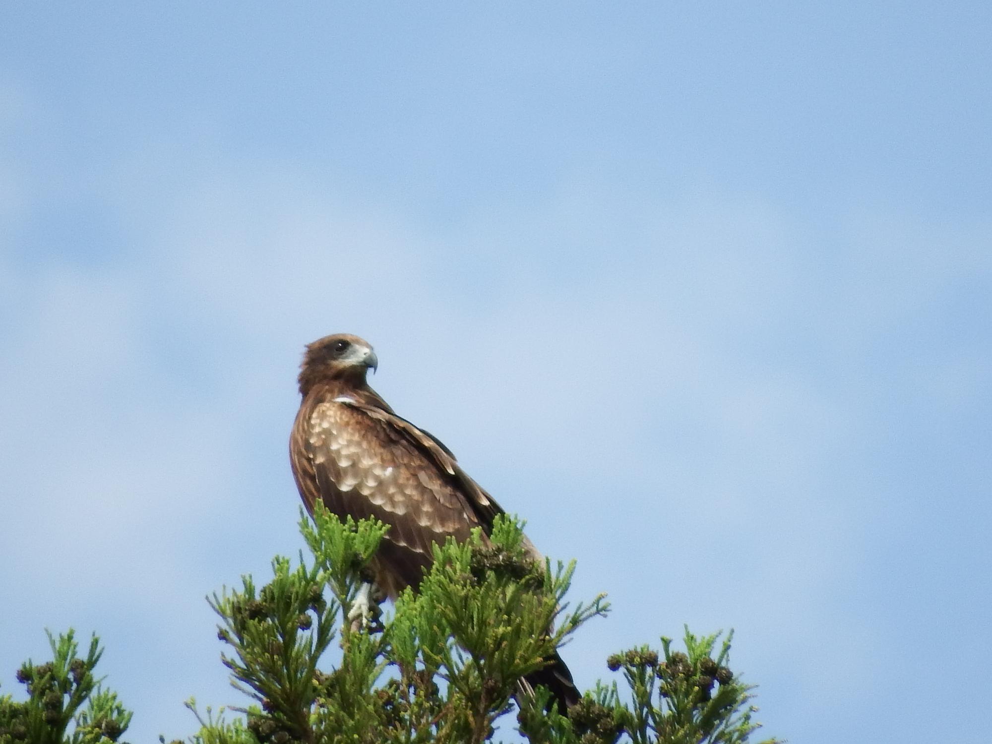 上の方からピーヒョロロと聞こえてきます。古墳の高い木のてっぺんにトンビ。